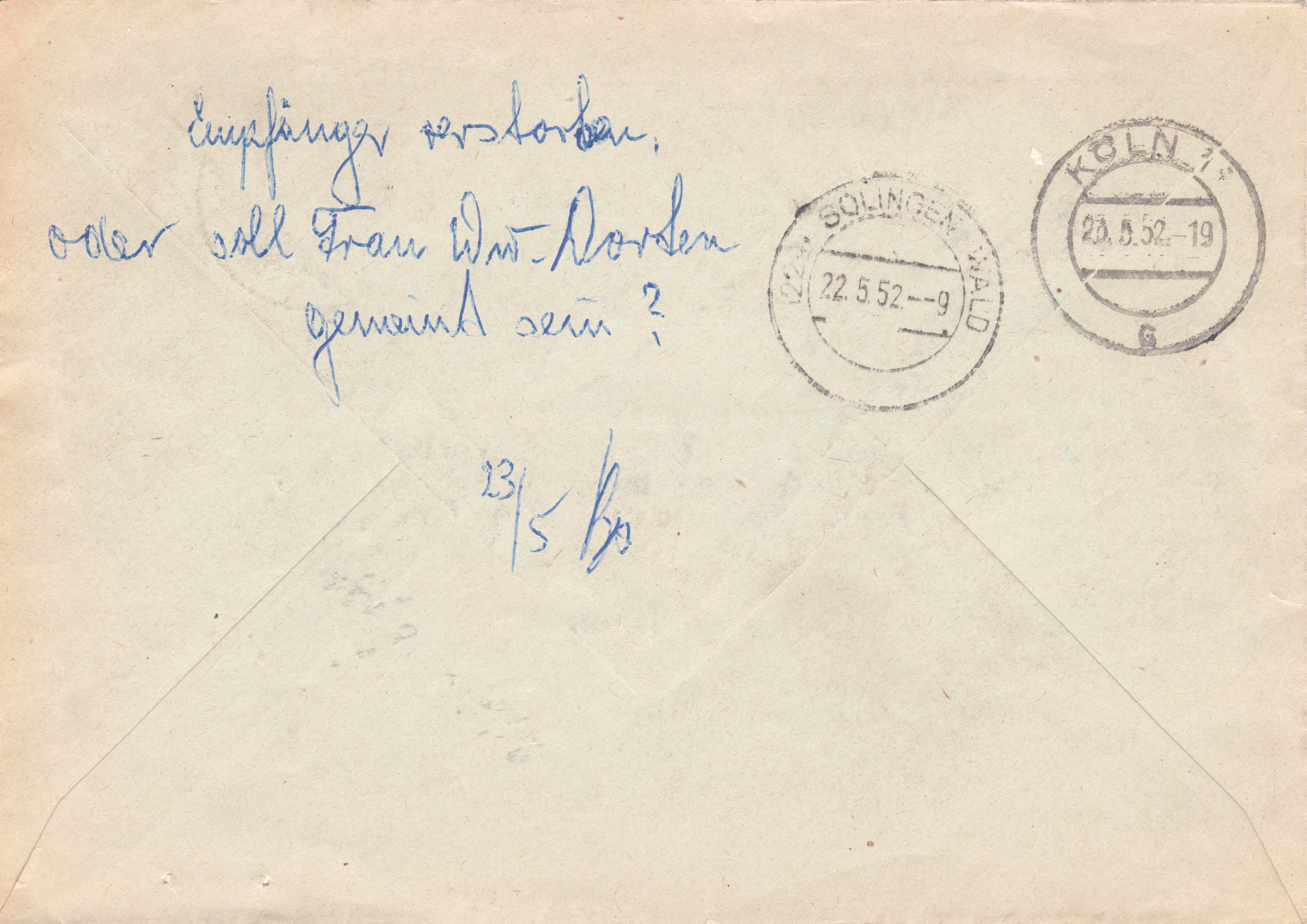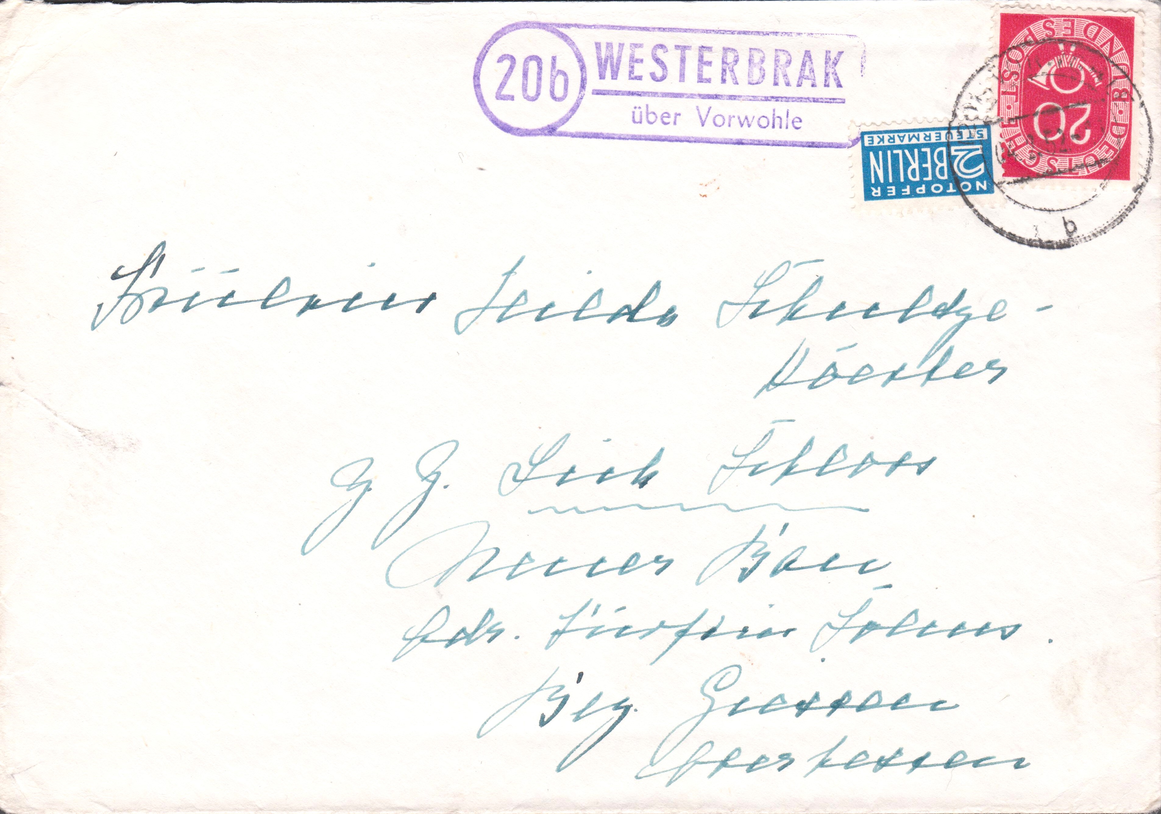 Einzelfrankatur 20 Pf auf Brief mit Landpoststempel "20 b WESTERBRAK über Vorwohle" in Lila.