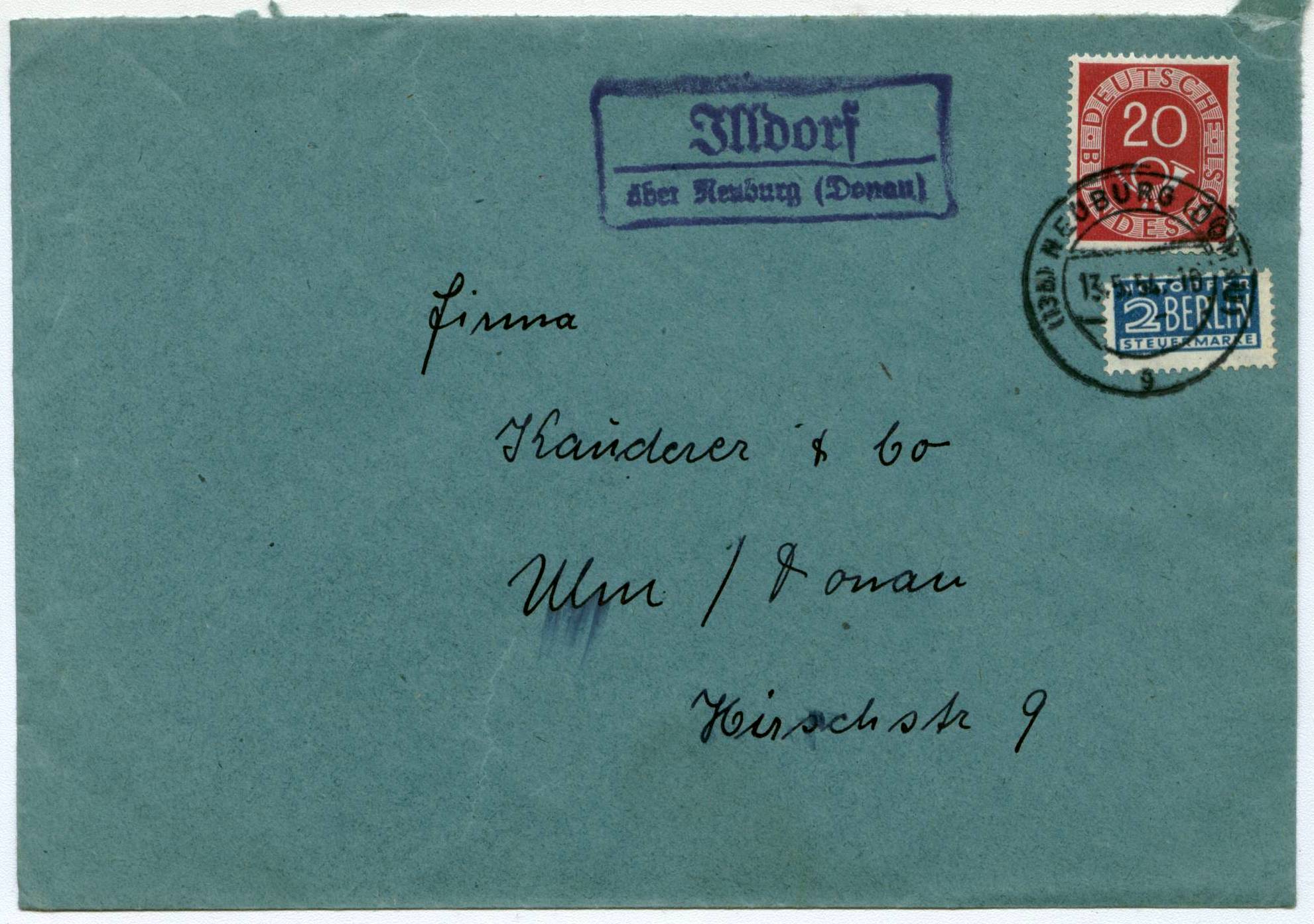 Eine Marke zu 20 Pf auf Brief. An sich nichts besonderes, aber hier ist noch ein lilafarbener sogenannter Landpoststempel abgeschlagen. Kleine Poststellen auf dem Lande hatten keinen eigenen Tagesstempel und durften nur einen solchen "Nebenstempel" führen. Die Frankatur wurde dann im nächsten grösseren Postamt mit dem Tagesstempel entwertet. Hier auf dem Beleg ist ein schöner Landpoststempel in alter Schrift aus Illdorf zu sehen. Der Tagesstempel von Neuburg (Donau) datiert vom 13.5.54.