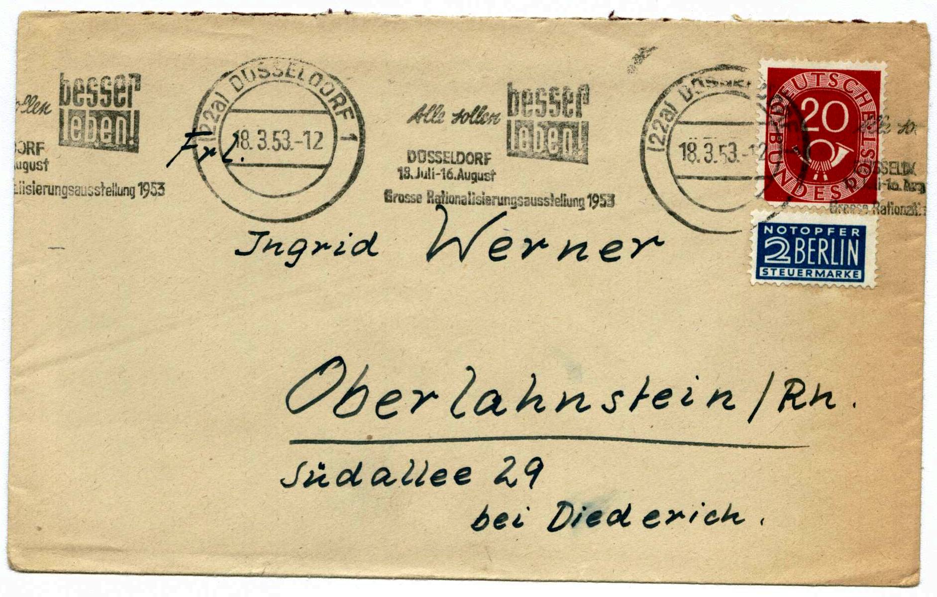 Und nochmals die Wertstufe 20 Pf. Auch wieder "nichts besonderes", aber für mich ist der Stempel interessant. Der Stempel der Stempelmaschine geht über die gesamte Breite des Briefes. Zu der Zeit waren einge Stempelmaschinen so eingestellt, dass immer der Stempel als "Band" über die Poststücke ging. Die heutigen Maschinen stempeln ja nur noch einmal den Tagesstempel und Werbe- oder Welleneinsatz. Dieser Brief wurde am 18.3.53 in Düsseldorf gestempelt.