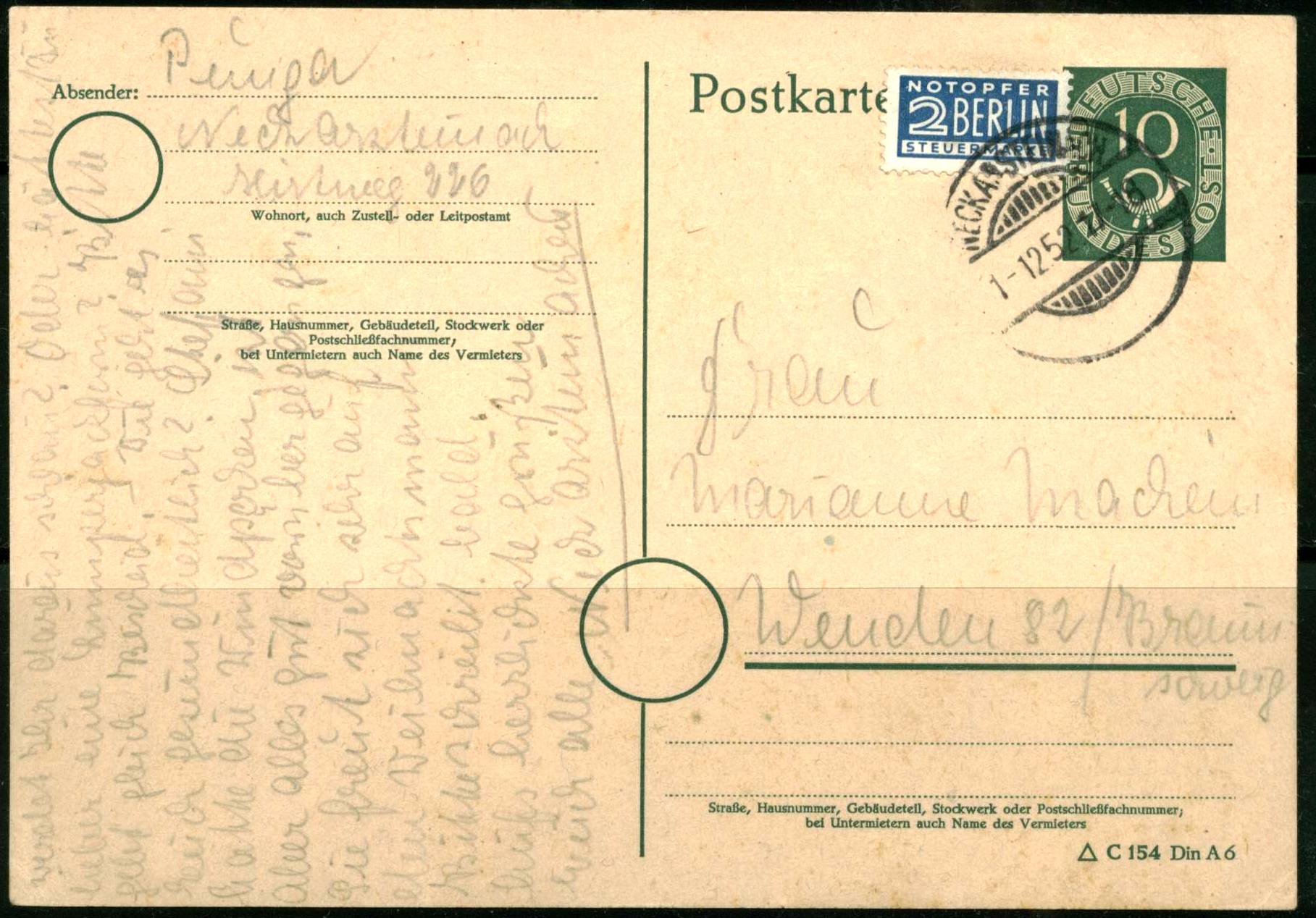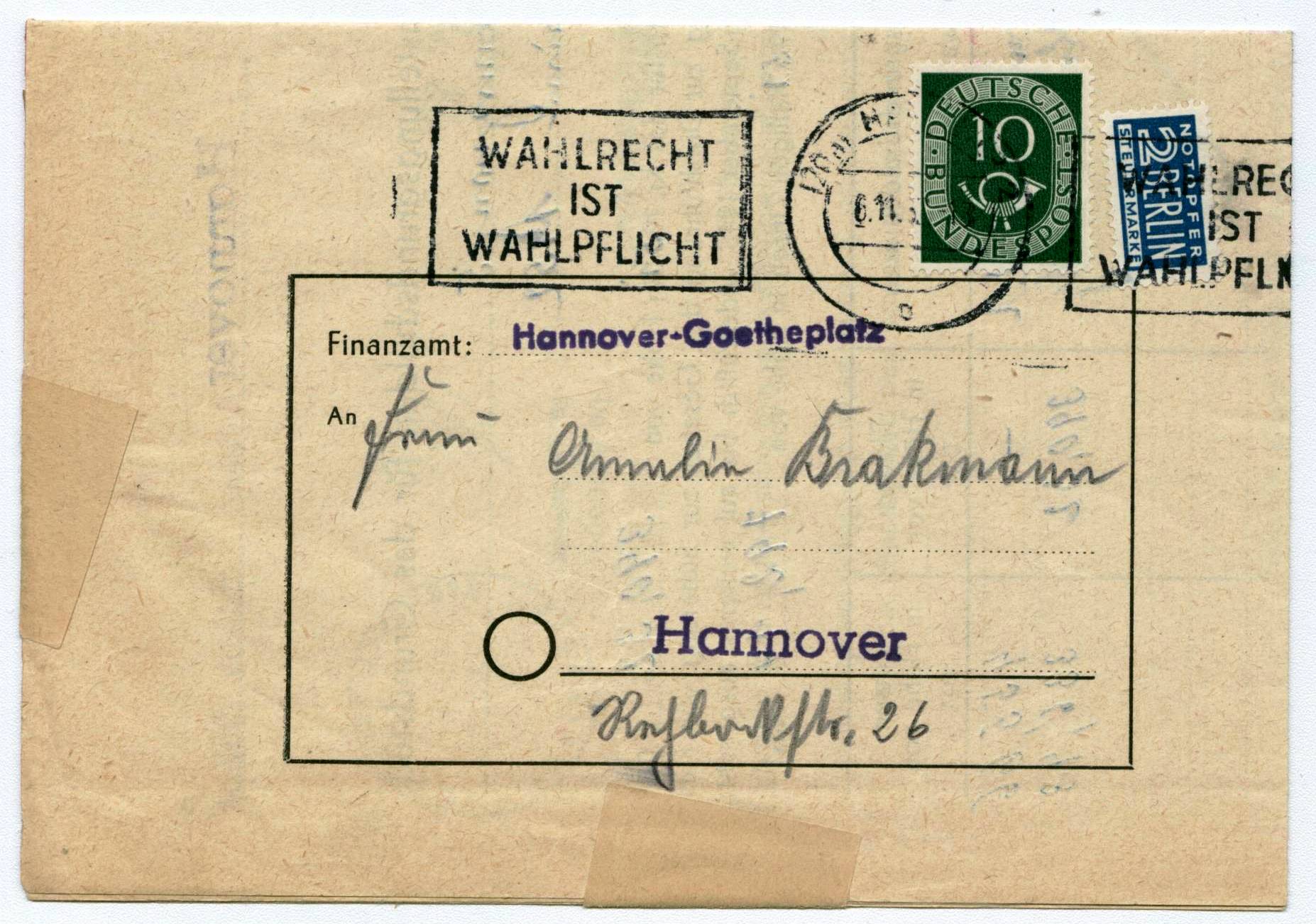 Nun ein Beleg mit der Portostufe 10 Pf: Es handelt sich um ein Formular des Finanzamtes Hannover, welches als Poststück versandt wurde. Abgestempelt am 6.11.52 in Hannover. An sich auch wieder nichts aufregendes, aber mich hat hier erneut der (Werbe-)Stempel interessiert. Wahlrecht ist Wahlpflicht. Wenn man sich die heutigen schwachen Beteiligungen an Wahlen anschaut, damals war man froh, ein Wahlrecht zu haben und hat es auch genutzt.