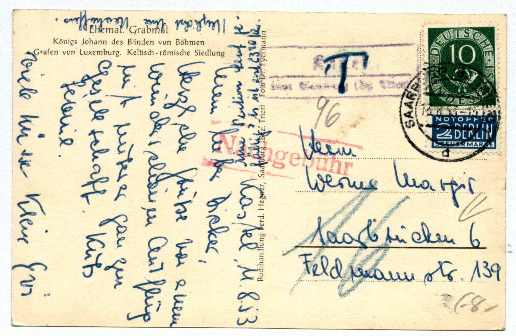 Und noch eine Postkarte mit der 10 Pf-Marke: Abgeschickt in Saarburg (Bz. Trier) am 13.8.53. Darauf noch ein mit Blaustift aufgebrachtes "T" und ein Stempel Nachgebühr. Unter dem T eine Bleistiftzahl 96 und über die Anschrift eine 16 mit Blaustift. Wie nun die Nachgebühren genau zustande kommen, kann ich nicht genau sagen. Mir ist zwar bekannt, dass das Saarland zu der Zeit als Ausland behandelt wurde, die Postkarte daher 20 Pf gekostet hätte, aber woher nun die krummen Summenangaben stammen, das entzieht sich meiner Kenntnis. Ich bin auch nicht unbedingt der "Belegesammler". Falls die Nachgebühren jemand deuten kann, bitte ich gerne um Aufklärung.
