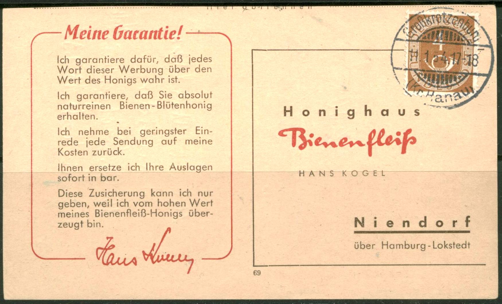 Auch hier noch ein kleiner Nachschlag: Posthorn 4 Pf auf einer Bestell-Postkarte an das Bienenhaus Honigfleiss, abgestempelt in Großkrotzenburg am 11.1.54. Die weitere Besonderheit an diesem Stempel sind die kleinen Buchstaben im Ortsnamen, normalerweise wurden immer Großbuchstaben im Stempel eingearbeitet. Solche Stempel sind noch mehr das Salz in der Suppe, da sie ganz selten zu finden sind.