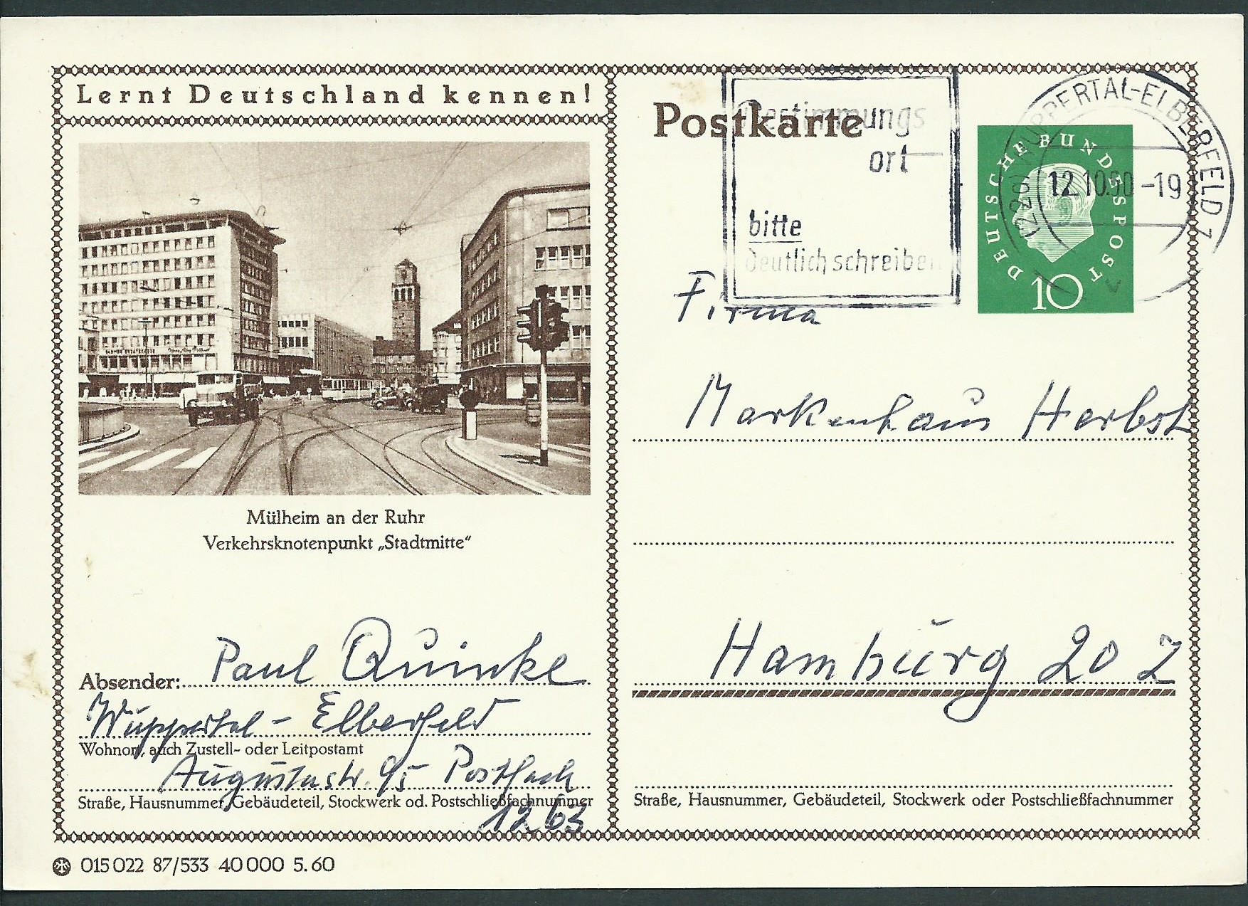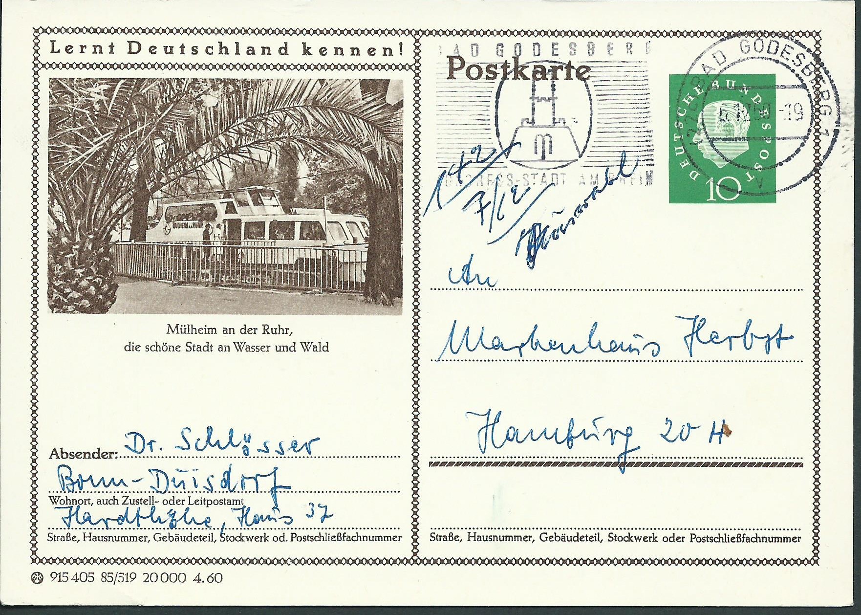 hier ist mir eine schöne Postkarte in die Hände gefallen: Aus der Serie „Lernt Deutschland kennen“ mit einem Wertstempel Heuss III 10 Pf und dem Bildmotiv „Messegelände Hannover“, gestempelt mit dem Messe-Sonderstempel Hannover vom 24.4.60. Ich finde, diese Sorte Karten hat das gewisse „etwas“ und die nehme ich gerne mit in die Sammlung auf.