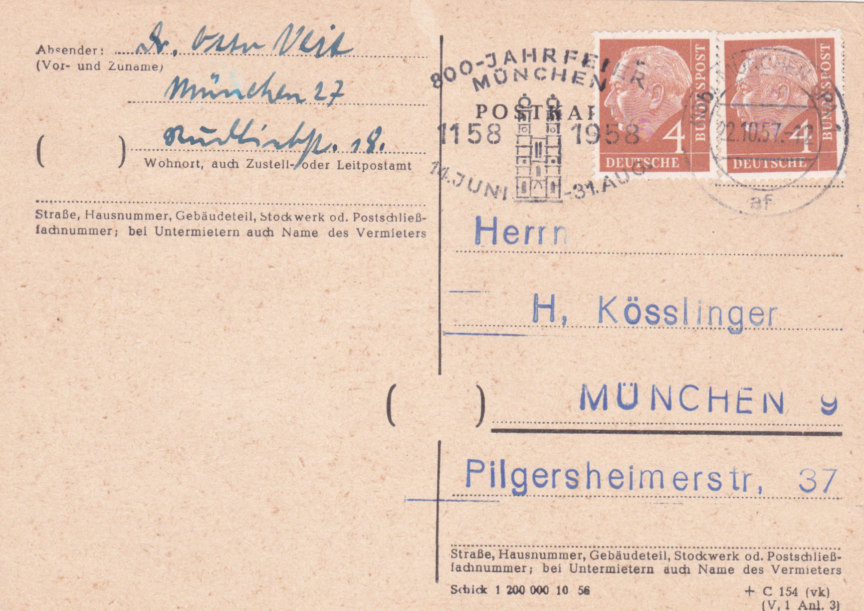 Postkarte im Ortsverkehr München vom 22.10.1957 mit Mehrfachfrankatur von zwei Marken zu 4Pf (MiNr 177).