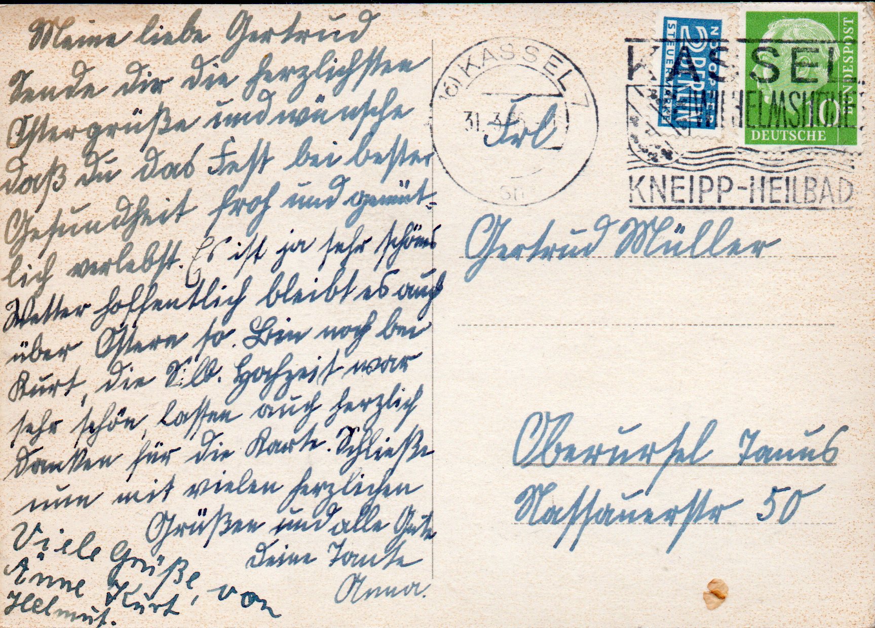 Zwar konnten Kunden dort Briefmarken kaufen und in einen Briefkasten werfen, diese Dienstleistung war für nachweisflichtige Sendungen jedoch nicht kostenlos. Der Einschreibebrief im Ortsverkehr war mit 60 Pfg. korrekt frankiert, die Marken wurden am 24.01.1955 zwischen 20:00 und 21:00 entwertet. Da die ortsübliche Öffnungszeiten nur bis 18:00 galten, wurde eine zusätzliche Späteinlieferungsgebühr in Höhe von 40 Pfg. erhoben und laut Stempel bar verrechnet. Der Brief erreichte das zuständige Zustellungs-Postamt am nächsten Tag um 06:00 laut Eingangsstempel.