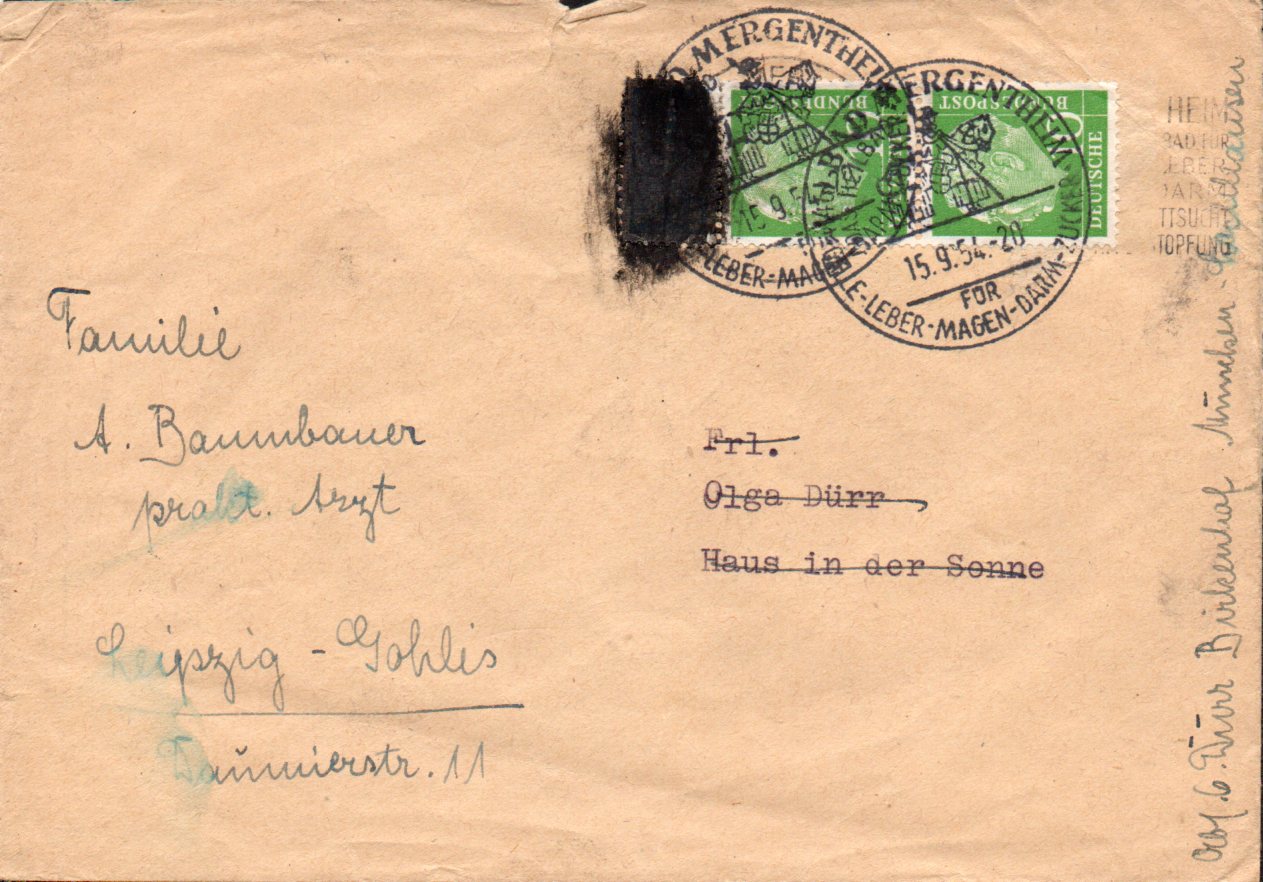 Inlandsbrief nach Leipzig (die DDR galt posttechnisch als Inland) auf wieder verwendeten Umschlag mit einer Mehrfachfrankatur des 10 Pfg.-Wertes. Die Schwärzung der Notopfermarke wird im Michel-Briefekatalog unter der Nummer z-PK I geführt.