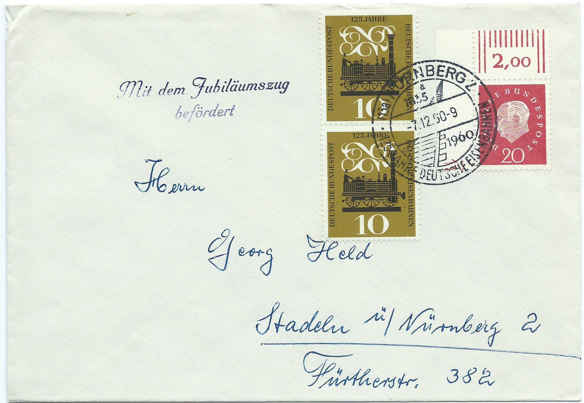 Und der 2. Beleg offenbart auch erst beim 2. Hinschauen die Besonderheit: Heuss III 20 Pf aus der linken oberen Bogenecke und unter dem Stempel versteckt das Druckerzeichen 11! Dazu noch die beiden Sondermarken Bund Mi.Nr. 345 125 Jahre deutsche Eisenbahnen , das ganze gestempelt mit einem Sonderstempel aus Nürnberg vom Ersttag der Sondermarken 7.12.60.