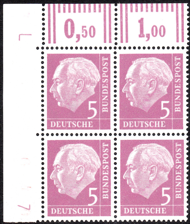 Postfrischer Eckrandviererblock des 5 Pfennig-Wertes auf fluoreszierendem Papier mit Druckerzeichen 7 und dem Kennbuchstaben "L" für Lumogenpapier (MiNr 179y W DZ).
