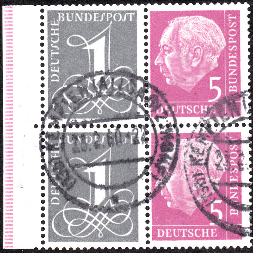 Gestempelter waagerechter Zusammendruck mit Zwischensteg MiNr WZ 16 aI X (20Pf+Z a I+1Pf) aus dem Markenheftchenbogen MiNr MHB 5 X. Auf dem Zwischensteg aI ist je eine senkrechte Strichelleiste in rosalila und in blaugrau.