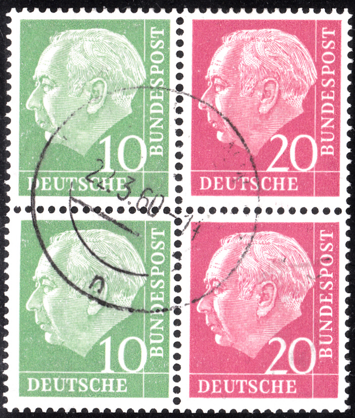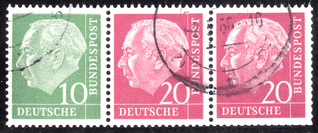Gestempelter waagerechter Zusammendruck MiNr W 21 X (10Pf+20Pf) mit einer zweiten 20Pf aus Markenheftchenblatt MiNr H-Blatt 8 X aus dem Markenheftchen MiNr 4 X.