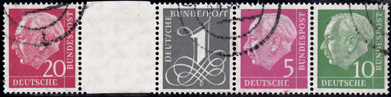 Gestempelter waagerechter Zusammendruck mit Zwischensteg MiNr WZ 16 b X (20Pf+Z b+1Pf) aus dem Markenheftchenbogen MiNr MHB 5 X. Der Zwischensteg b ist ohne Strichelleisten.