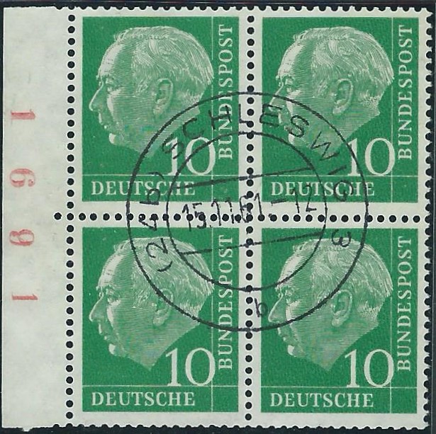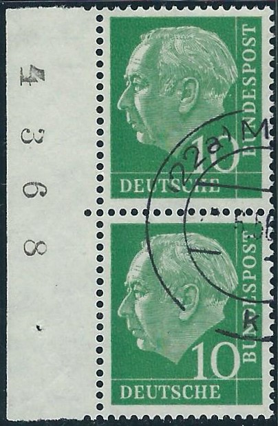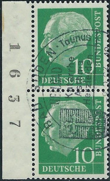 Und nun schauen wir uns erst einmal die Bogenränder an: Da erkennt man bei dem 7 Pf-Wert und dem 10 Pf (183 x)-Wert einen „normalen“ breiten Rand. Die beiden mittleren Stücke haben einen schmaleren Rand und man achte weiterhin auf die Stellung der Bogenzähler! Bei der 183 x ist die Nummer weiter nach links aussen versetzt und bei den Lumogen-Werten steht sie mehr nach rechts innen. Das sind schon mal Hinweise, die man vor Erwerb der Stücke so prüfen kann. Die Fluoreszenz-Lampe kommt natürlich auch zum Einsatz, um ganz sicher zu gehen.