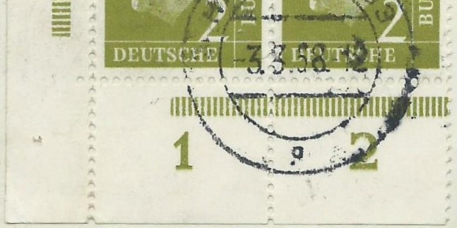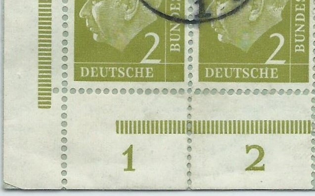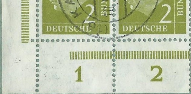 Nun die Frage, warum ist das so? Ein Blick in den Michel verrät uns, dass die Marke eine ziemlich grosse Auflage hat: 112.000.000 Stück. Sie wurde auch nicht in einem Rutsch gedruckt, sondern immer wieder bei Bedarf nachgedruckt. Daher auch die vielen unterschiedlichen Hausauftragsnummern (abgekürzt HAN, die hatte Rainer schon etwas weiter vorher mal vorgestellt), die im Michel-Spezial gelistet sind. Bei den jeweiligen Druckvorgängen sind die Druckplatten immer wieder neu zusammen gesetzt worden und da kamen dann schon mal die leichten Variationen zustande.