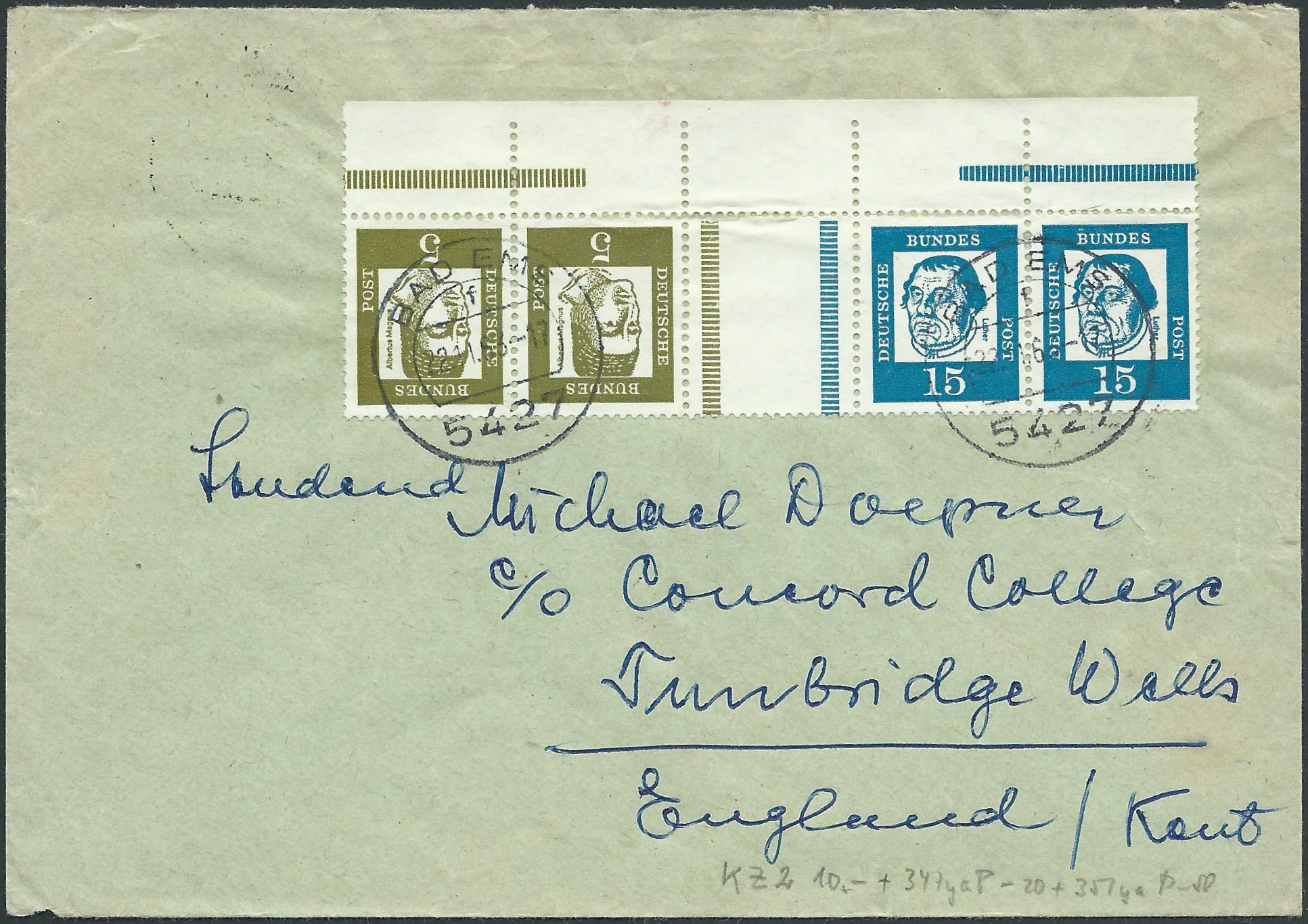 auf einem schon etwas zurückliegenden Streifzug durch Wühlkisten an einem Tauschtag sind mir 2 Belege in die Hände gefallen, welche ich nicht liegen lassen konnte. Der erste ist ein Eilbrief aus Husum nach Bad Brückenau, gestempelt am 9.9.65. Auf der Briefrückseite finden wir die üblichen Durchgangsstempel der Stationen, die der Beleg durchlaufen hat. Interessant ist da vor allem der Bahnpoststempel. Mich selber hat allerdings mehr das Oberrandstück der 90-Pf-Marke Bedeutende Deutsche interessiert. Gerade die höheren Pfennig-Werte der Serie mit Oberrand sind schwer zu erhalten, da nimmt man auch gerne mal einen Beleg, um den Reihenwertzähler zu dokumentieren.