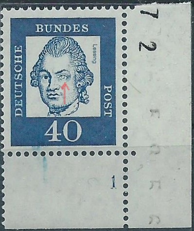 Bund Mi.Nr. 355y, Bedeutende Deutsche 40 Pf als rechte untere Ecke mit Formnummer 1. Erstmal ist die blaue Farbverwischung unten auffällig. Dann aber ist mir aufgefallen, dass das linke Auge von Herrn Lessing irgendwie abhanden gekommen ist. Das ist doch schon mal eine recht markante Druckzufälligkeit. Und somit wird das gute Stück nicht in das Album vom Tauschpartner wandern, sondern in meinem Kuriositätenkabinett landen ;)