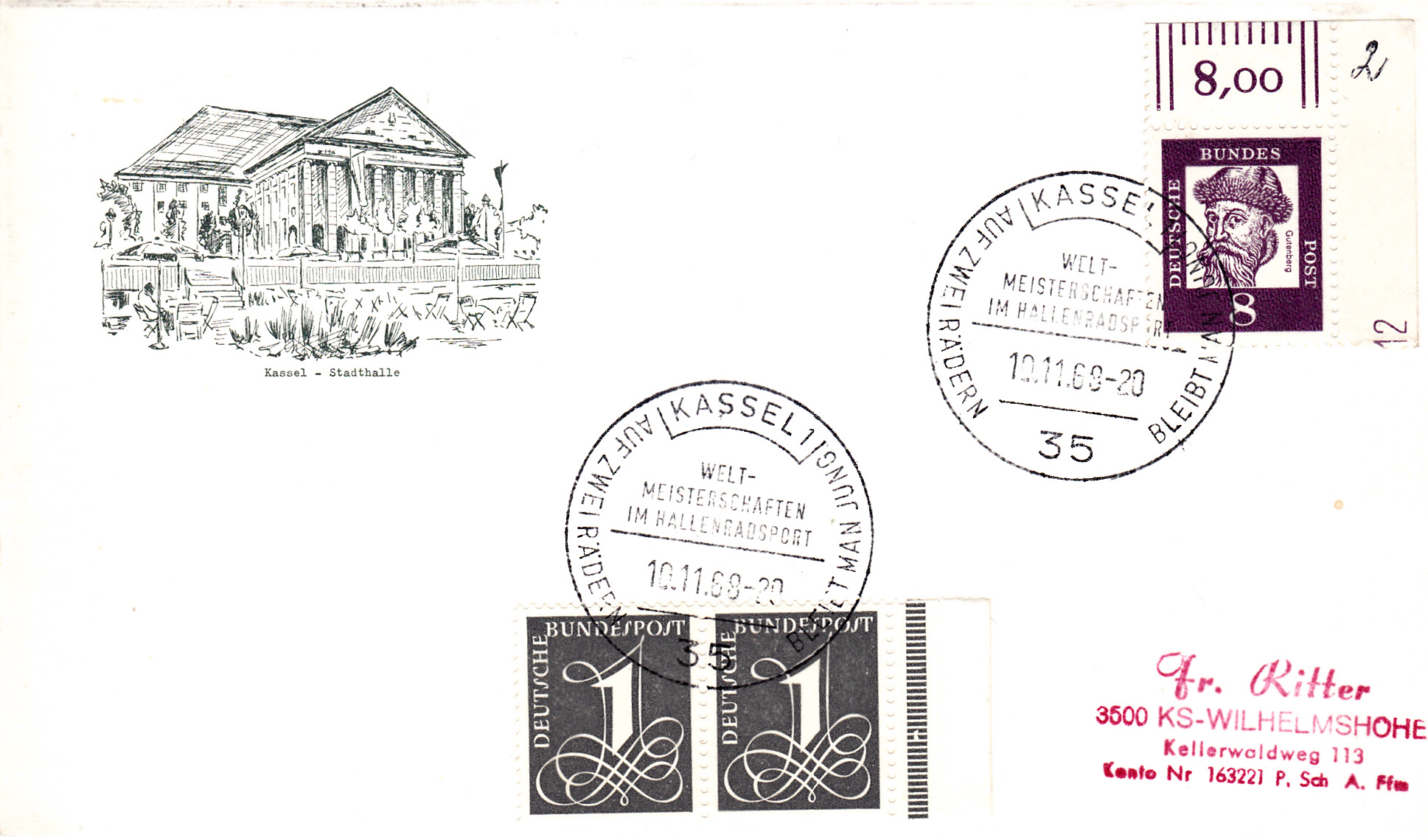 Ein Kehrdruck mit Zwischensteg der Marke zu 20Pf aus der Dauerserie "Berühmte Deutsche" (MiNr KZ 3) zusammen mit einer 50Pf-Marke Brandenburger Tor und einem Kehrdruck der 10Pf-Marke aus der Berliner Ausgabe der Dauerserie "Berühmte Deutsche" auf einem portogerechten Einschreibebrief von Duisburg nach Kassel.