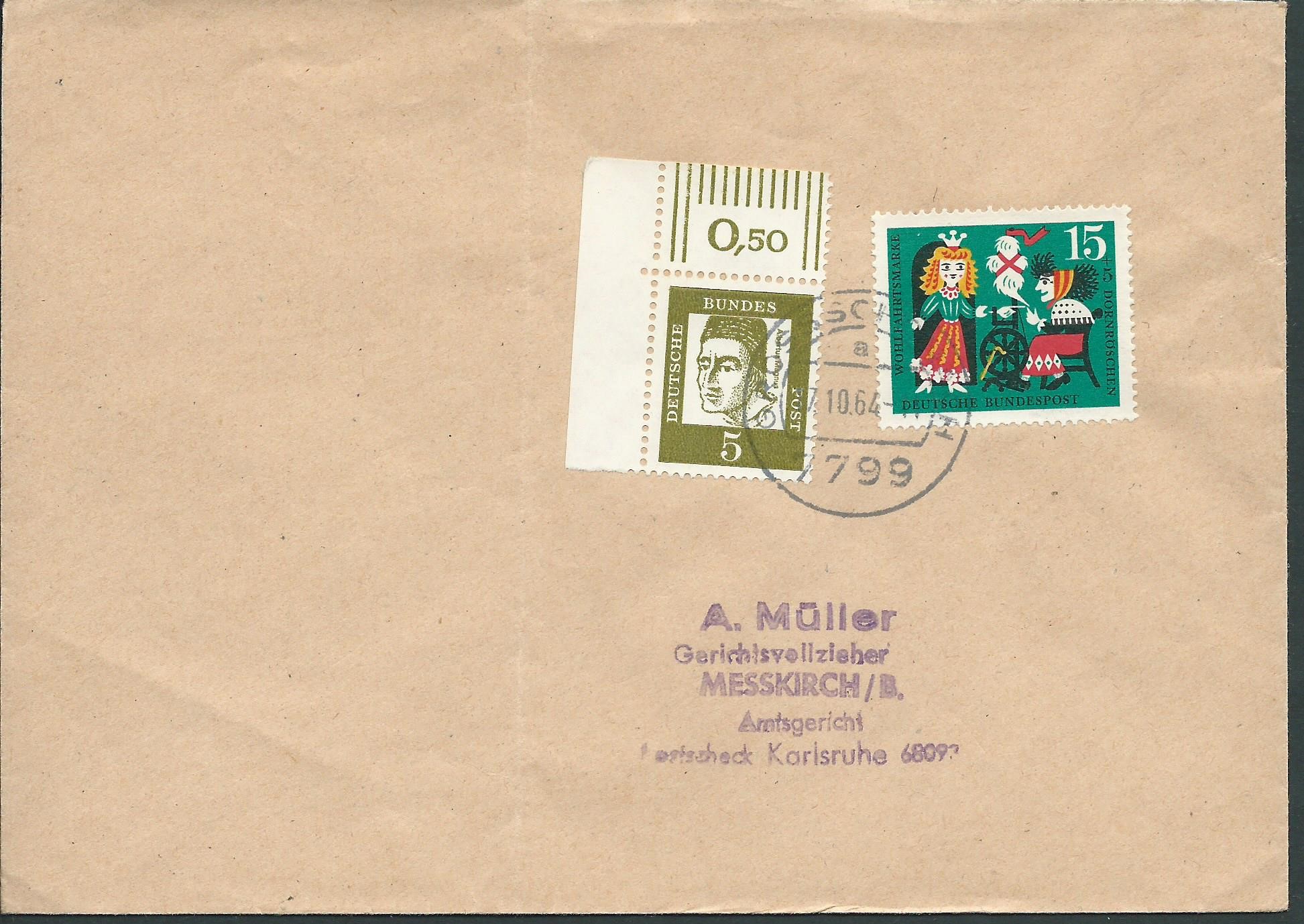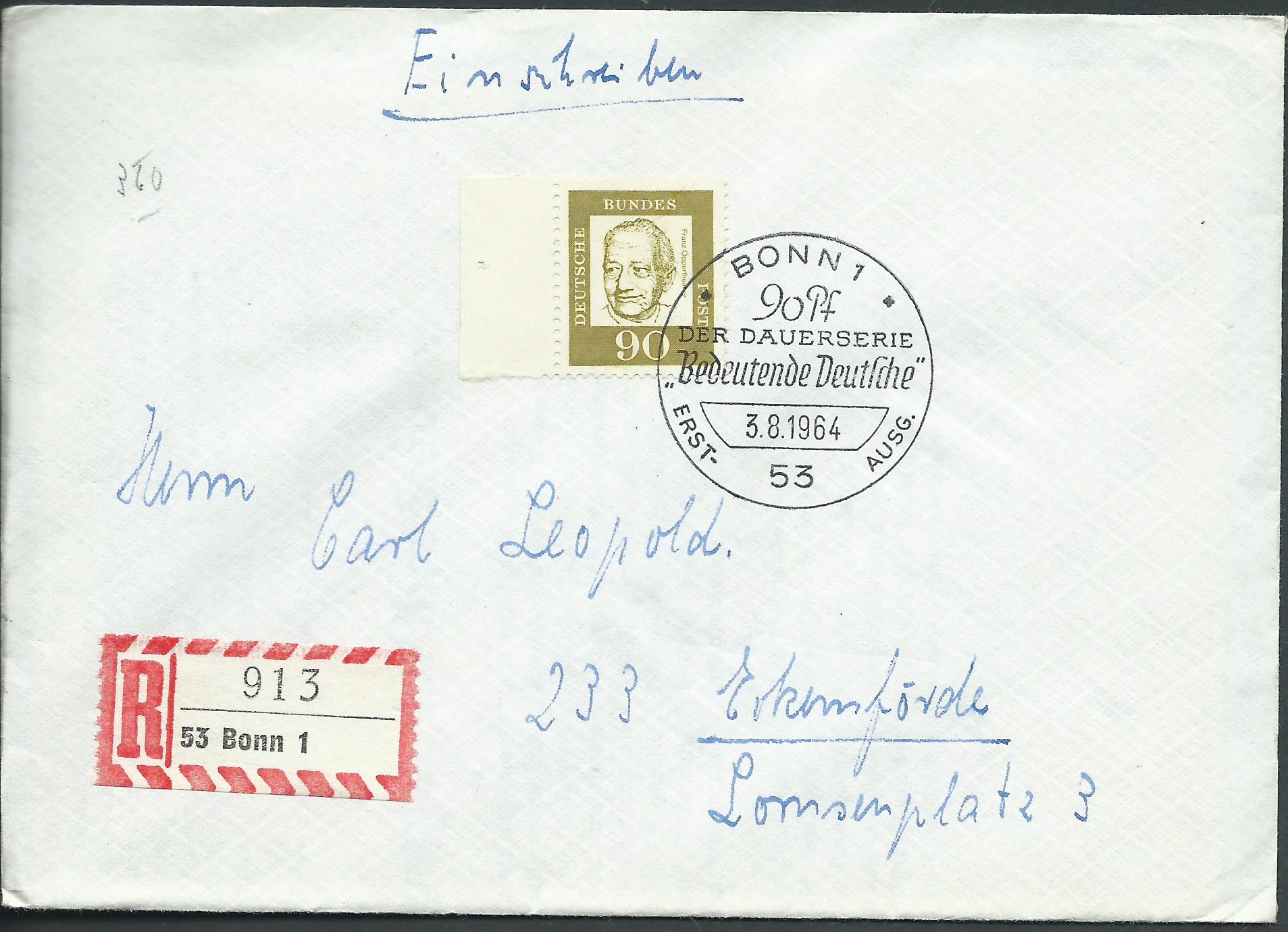 hier ist mir ein schöner Ersttagsbeleg dieser Serie mit dem 90-Pf-Wert aufgefallen. Es ist ja bekanntlich der letzte verausgabte Wert vom 3.8.64, hier vom linken Seitenrand und mit Ersttagssonderstempel als Eischreiben versandt. Der Portosatz stimmt zwar vorne und hinten nicht (Brief 20 Pf und Einschreiben 40 Pf ergeben 60 Pf), aber wer hat schon Marken mit Rand verklebt? Daher in meinen Augen ein aufhebenswerter Beleg!