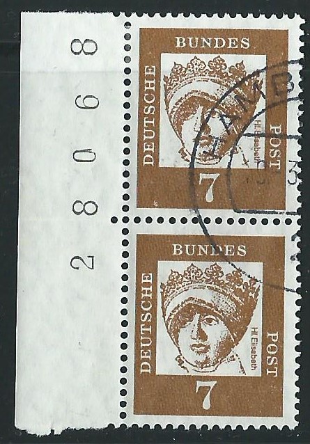 kürzlich sind mir 2 weitere schöne Sammelstücke in die Hände gefallen, die ich sofort in die Sammlung aufgenommen habe. Es sind Bogenzählnummern der 7 und 40 Pf x-Papier (also ohne Fluoreszenz) gestempelt am linken Bogenrand jeweils 5-stellig.
