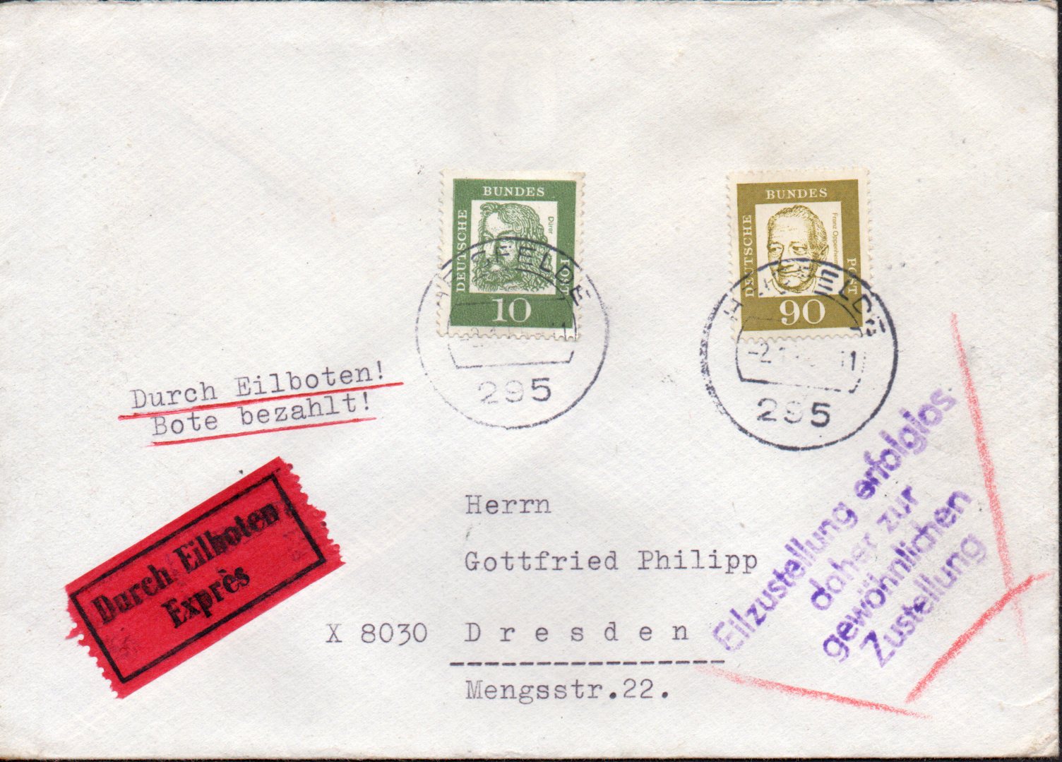 Eilbrief nach Dresden mit Hinweisstempel "Eilzustellung erfolglos"