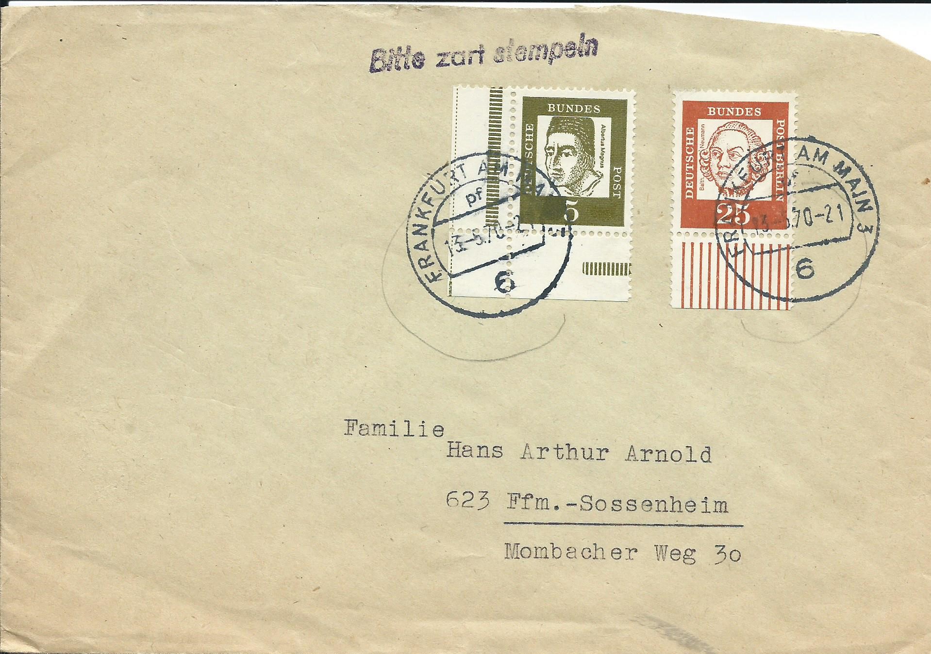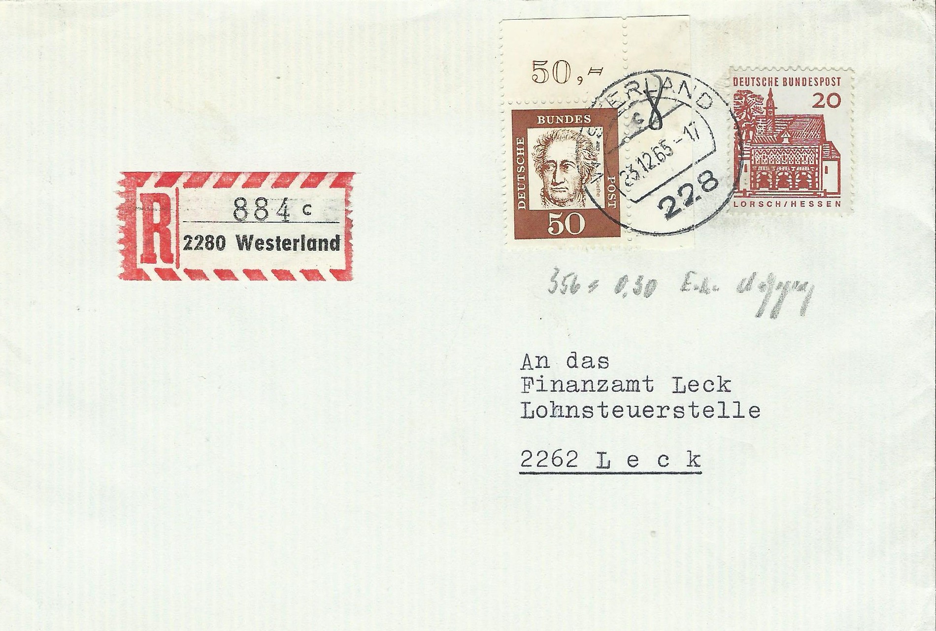 hier habe ich eine schöne rechte obere Bogenecke der Wertstufe 50 Pf mit Zusatzfrankatur kleine Bauten 20 Pf auf einem Einschreibbrief. Dieser Brief ist laut Adresse absoluter Bedarf, denn wer schreibt schon gerne dem Finanzamt? Abgestempelt wurde er in Westerland (auf der Insel Sylt) am 23.12.65.