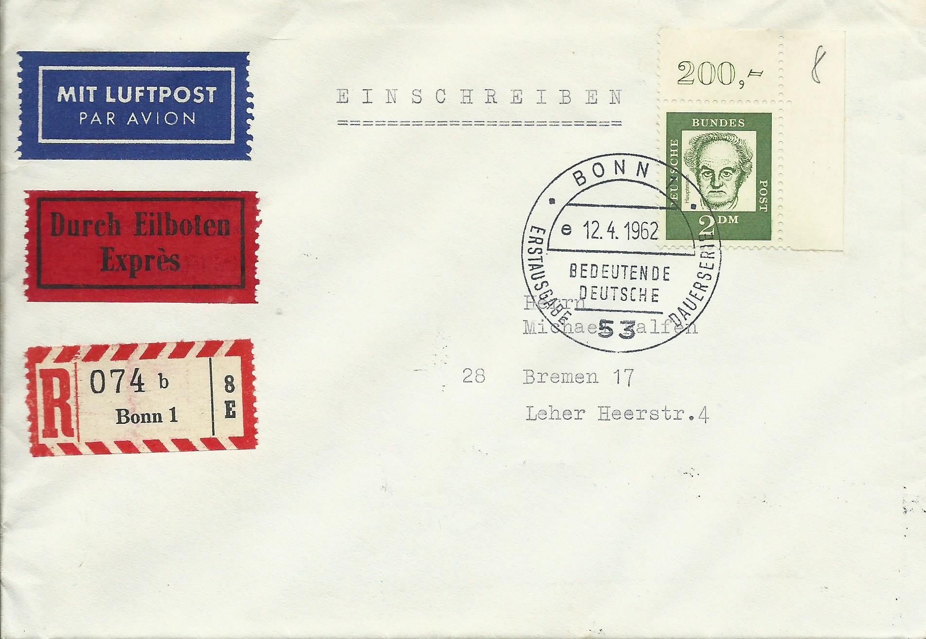 Und noch eine rechte obere Bogenecke, dieses Mal die 2 DM-Marke. Sie klebt auf einem Luftpost-Eilboten-Einschreibbrief von Bonn nach Bremen. Ich habe hin und her gerechnet, aber portorichtig wird das Ganze irgendwie nicht. Zum Glück ist mir persönlich das auch egal, mir geht es „nur“ um die Marke als Ecke als solches, während der Portostufensammler die Nase rümpfen und den Beleg liegen lassen würde. Die Marke wurde mit dem Ersttagsstempel Bonn am 12.4.62 entwertet.