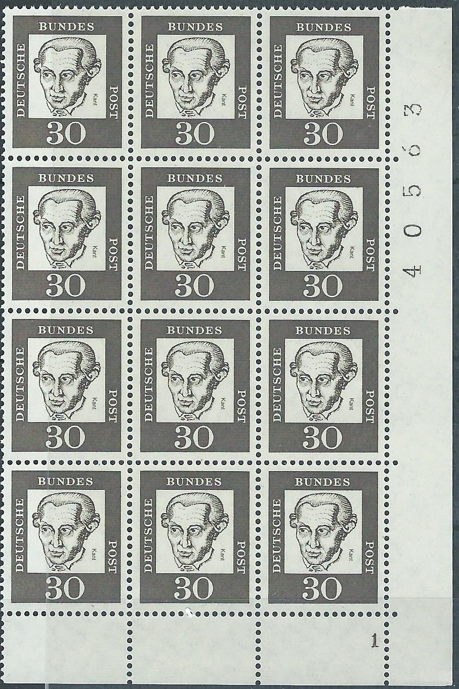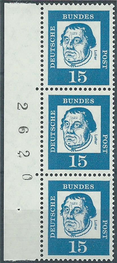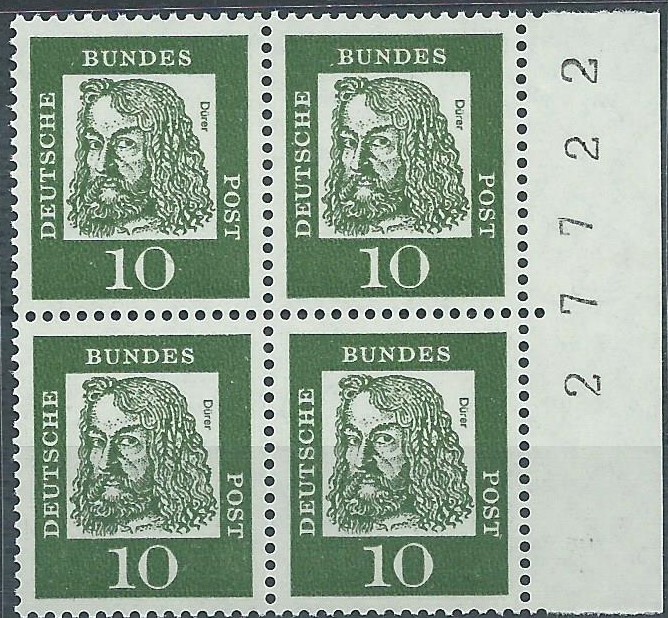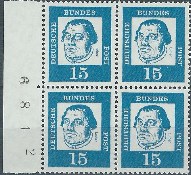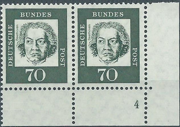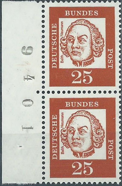 Und ein postfrisches senkrechtes Paar aus der linken unteren Bogenecke zu 20 Pf. Hier ist auffallend der