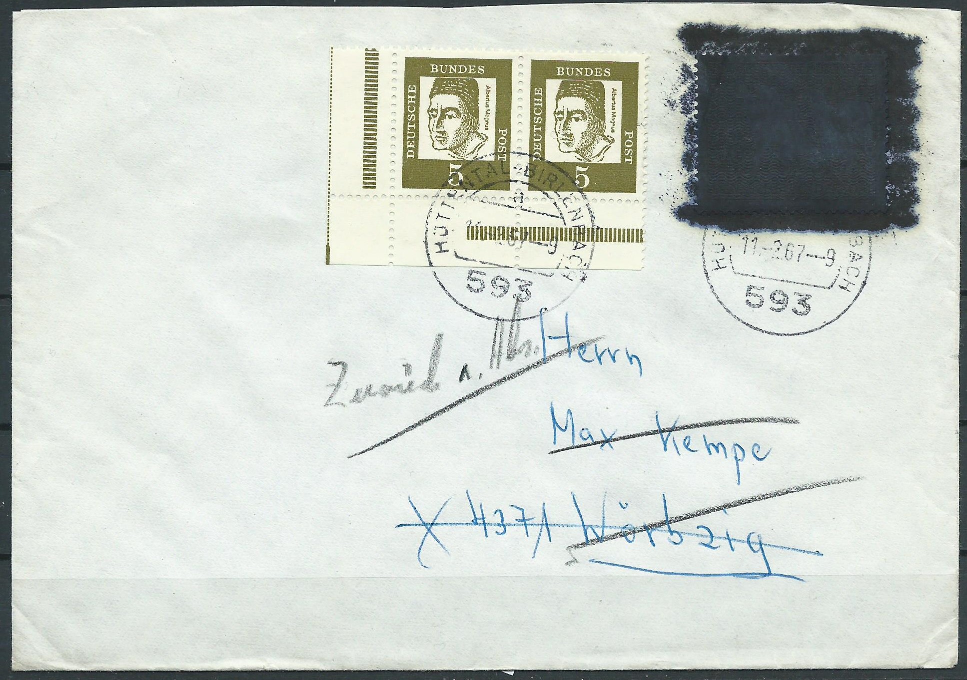 Hintergrundinfo: Der sogenannte Postkrieg betraf Sendungen aus der Bundesrepublik Deutschland in die DDR (und teilweise weitere Ostblock-Staaten) Die Deutsche Bundespost hatte Marken verausgabt, deren Motive in dem Empfängerland nicht erwünscht waren und daher von der dortigen Postverwaltung unkenntlich gemacht wurden. Da gibt es unterschiedliche Arten, von weisser über braune bis hin zu schwarzer Farbe, die über die beanstandeten Marken geschmiert wurde. Am schlimmsten betroffen waren die Marken Bund Mi.Nr. 215 und 479 "Vertreibung". Auch einige Motive der Bauwerke-Serien wurden unkenntlich gemacht.