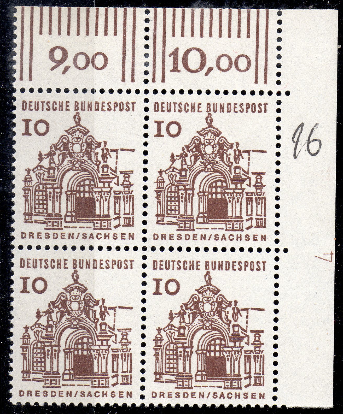 Bei der 10-Pfg-Marke ist ein Plattenfehler katalogisiert (Kapitell der rechten Säule am Eingang gebrochen), der auf Feld 34 einer Teilauflage sowie in der Rollenmarkenversion vorkommt. Auf Marken der Rollenausgabe ist dieser wesentlich seltener anzutreffen!