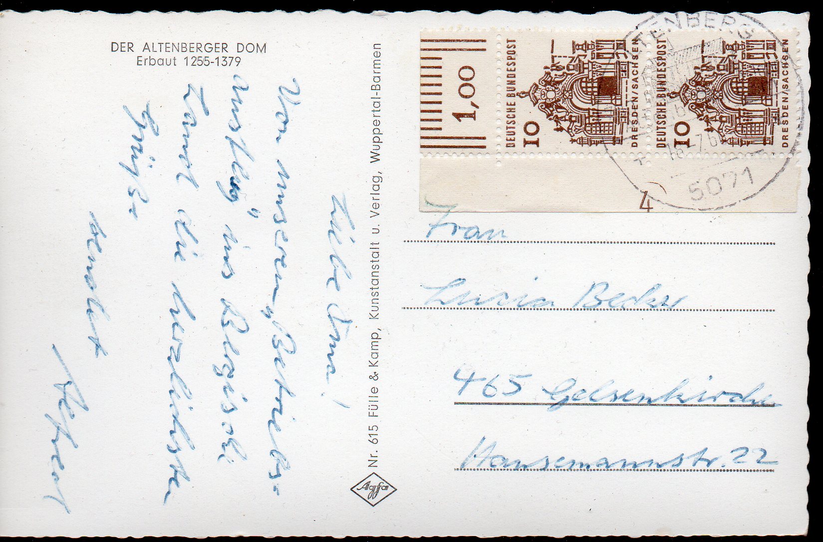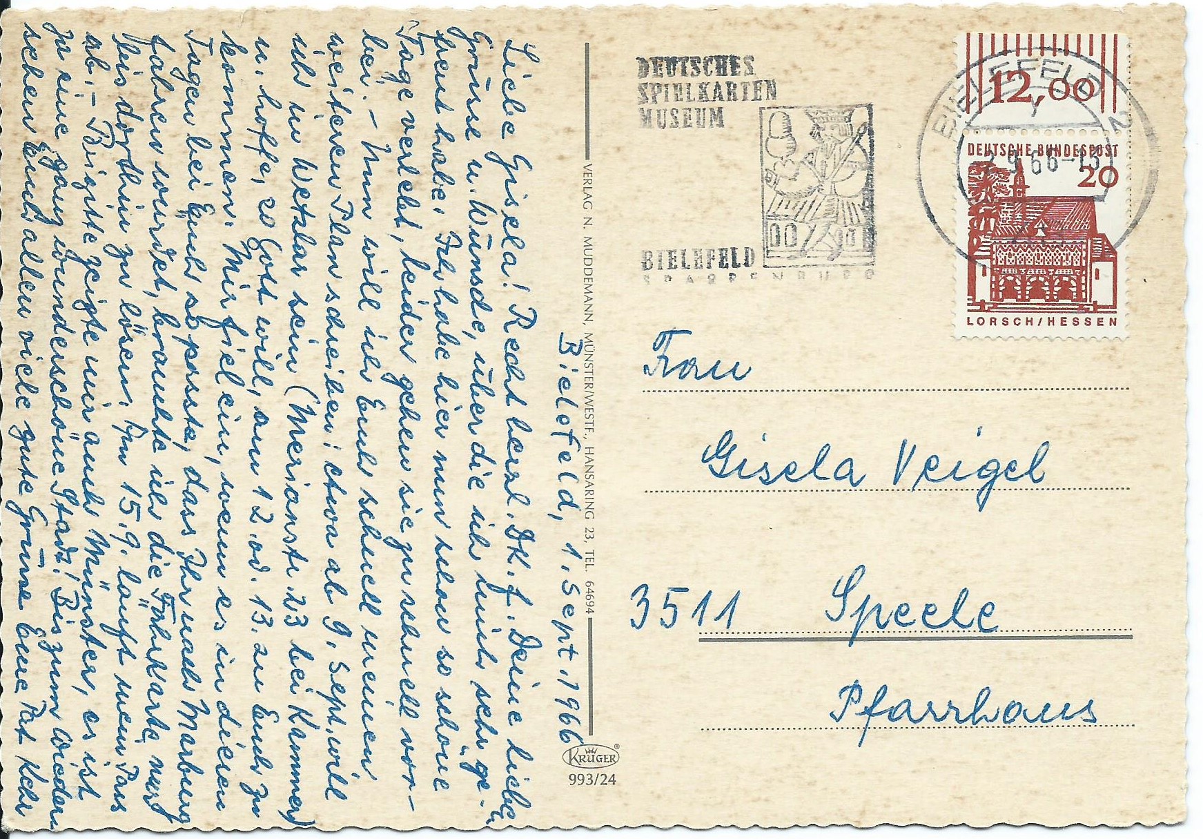 Als nächstes eine Bedarfs-Postkarte mit einem Oberrandstück der 20 Pf-Marke. Maschinenstempel Bielefeld vom 2.9.66, Reklamestempel Deutsches Spielkarten-Museum.
