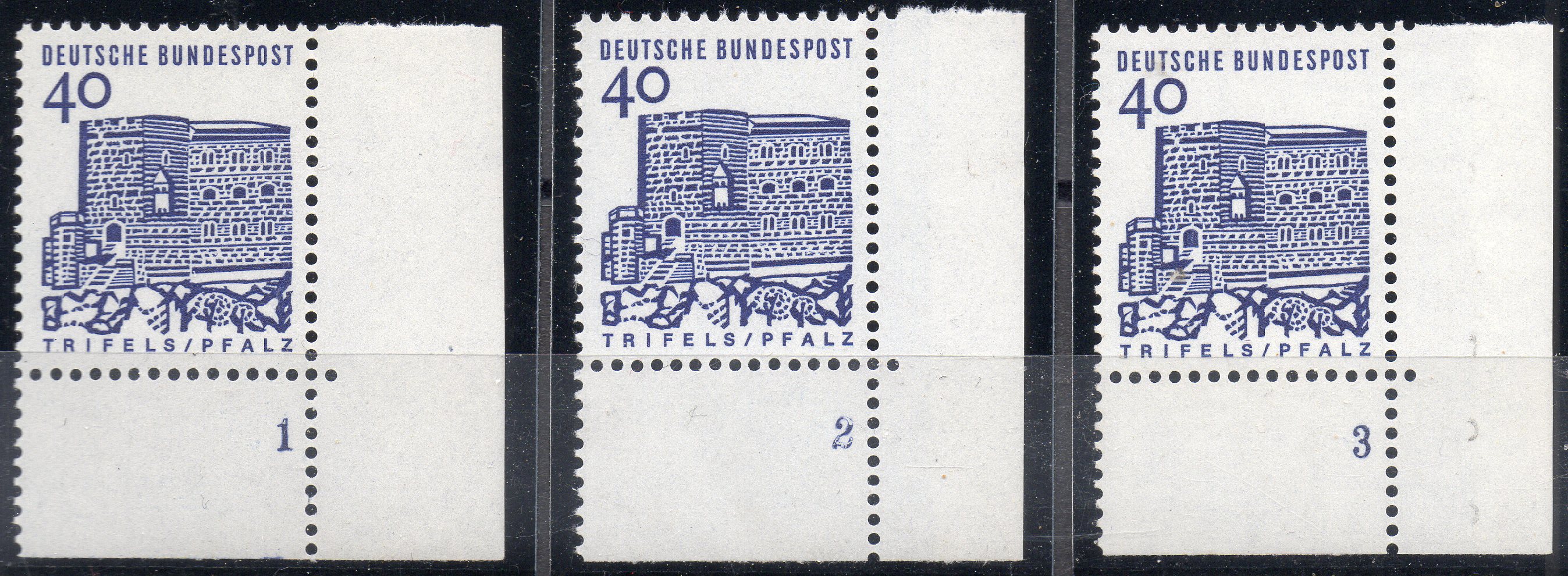 Die im Stichtiefdruck ausgegebenen Werte (ab 40 Pfg) tragen auf dem Eckrand unter Feld 100 eine Formnummer (1-3)