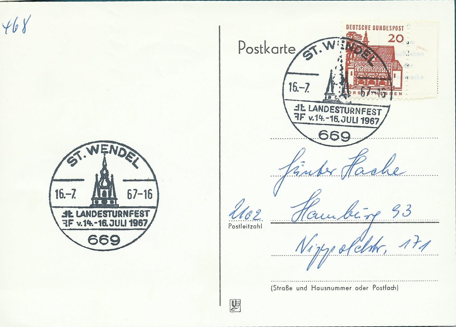 Dann eine Postkarte mit einer 20 Pf-Marke und rechtem Seitenrand. Hier ein Sonderstempel von St. Wendel vom 16.7.67. Man beachte das Druckerzeichen auf dem Randstück!