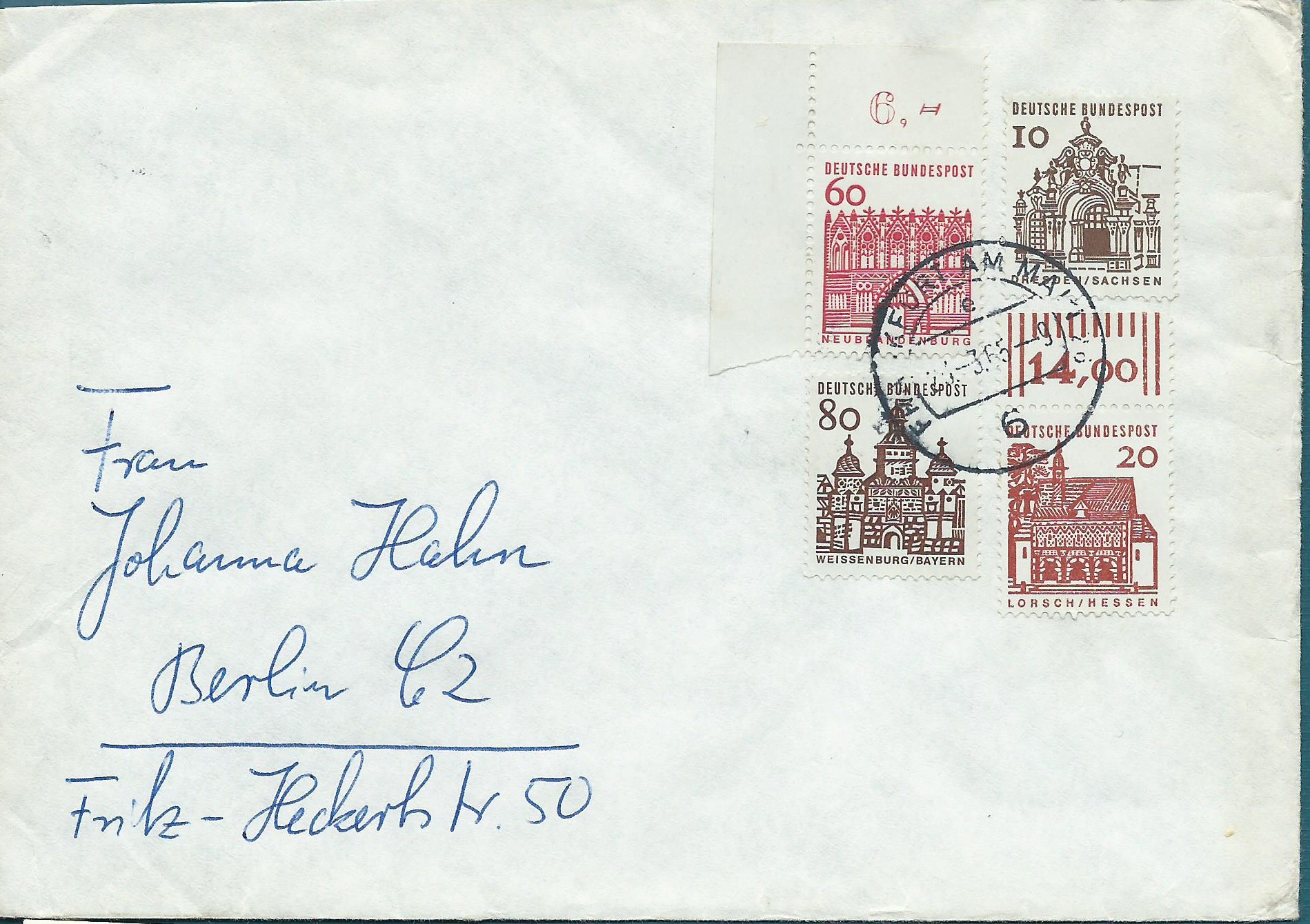 Hier ein hoffnungslos überfrankierter Brief mit 4 verschiedenen Werten zu 10, 20 (Oberrand), 60 (Eckrand links) und 80 Pf. Den wollte ich in der 1-€-Kiste nicht liegen lassen, wann kann man schon mal so günstg eine Ecke erwerben? :D Und die goldene Sammlerregel: Nicht abweichen, lieber als Beleg (oder zur Not als Briefstück) aufbewahren, dann bleibt der Stempel komplett erhalten.