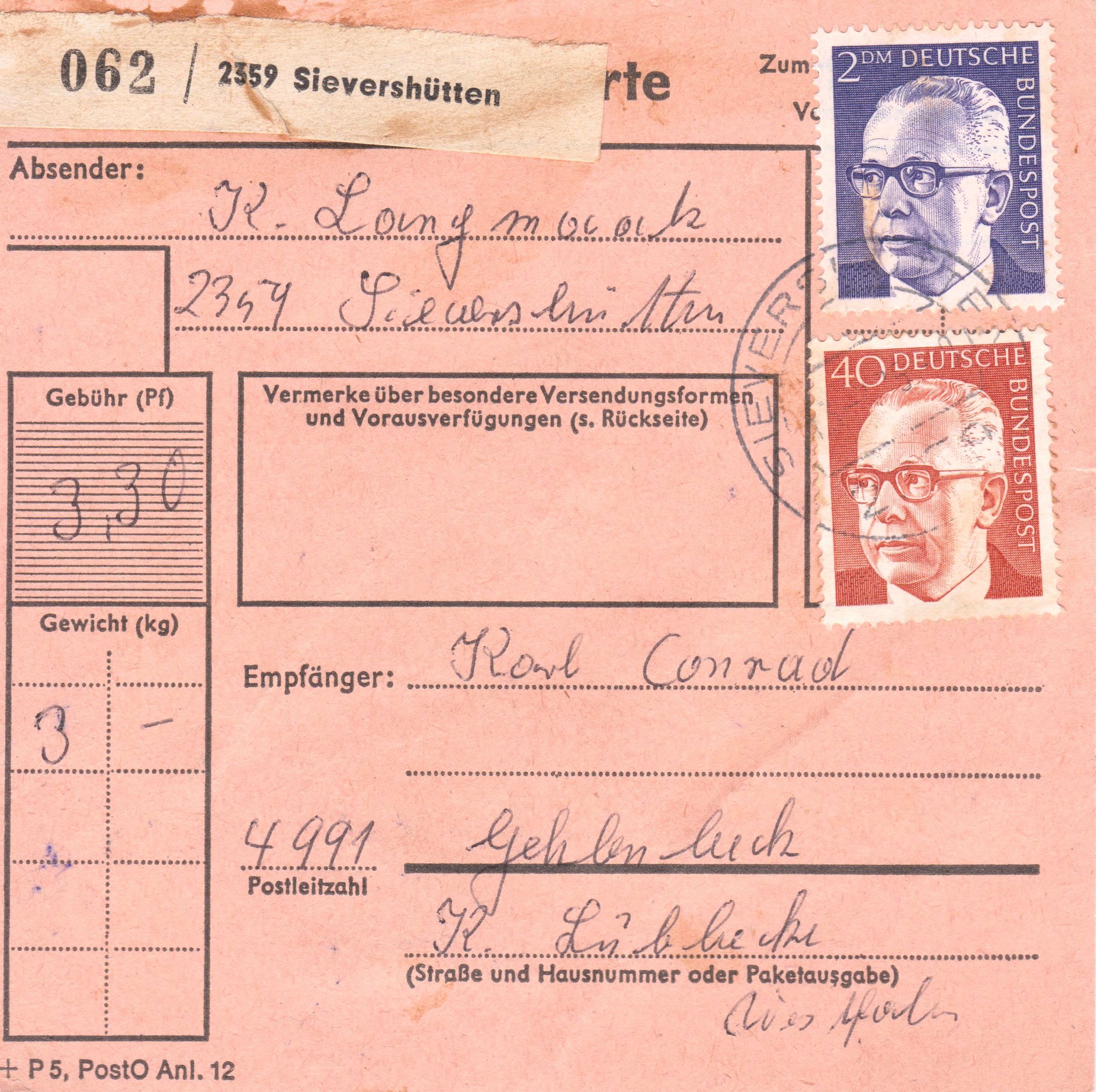 Paketkarte mit Mischfrankatur 2 DM, 3 x 40 Pf sowie 10 Pf zur Abdeckung der Portostufe von 3,30 DM für ein Paket mit einem Gewicht von 3 kg, aufgegeben in 2359 Sievershütten: