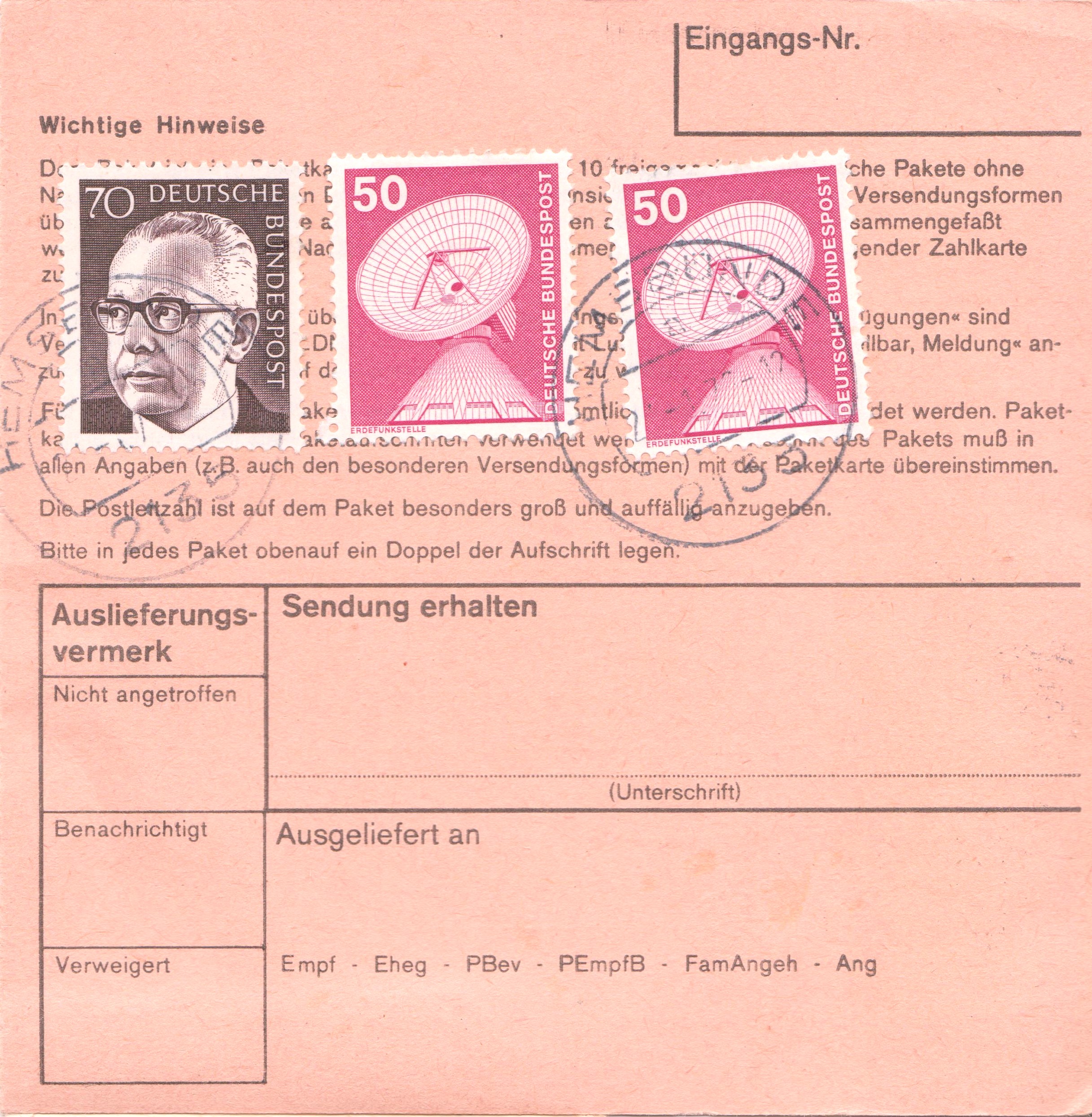 Paketkarte mit Mischfrankatur 3 x 70 Pf sowie 2 x 50 Pf Dauerserie Industrie & Technik zur Abdeckung der Portostufe von 3,10 DM für ein Paket mit einem Gewicht von 2 kg, aufgegeben in 2135 Hemsbürde: