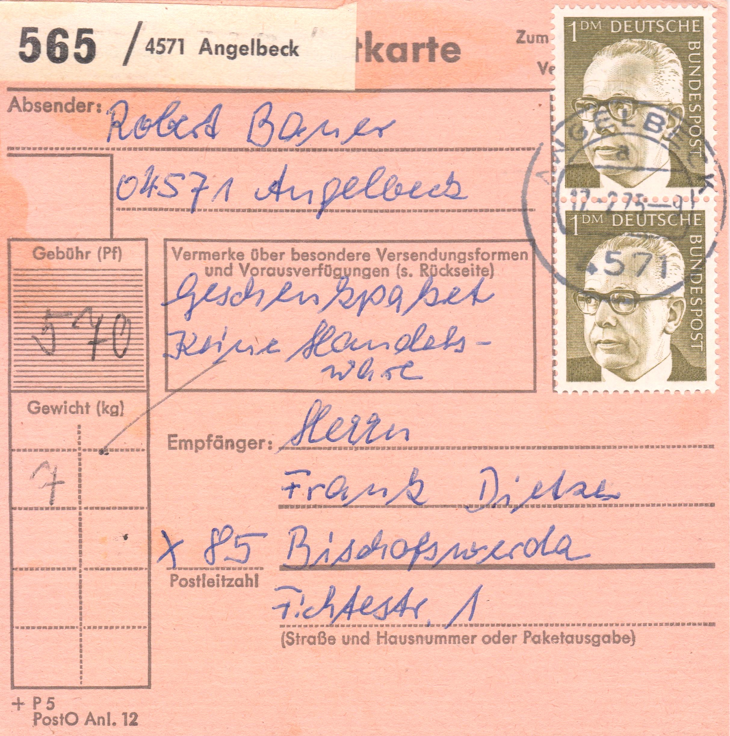 Paketkarte mit Mischfrankatur 4 x 1 DM, 2 x 50 Pf, 1 x 40 Pf sowie 1 x 30 Pf Dauerserie Heinemann zur Abdeckung der Portostufe von 5,70 DM für ein Paket mit einem Gewicht von 7 kg, aufgegeben in 4571 Angelbeck:
