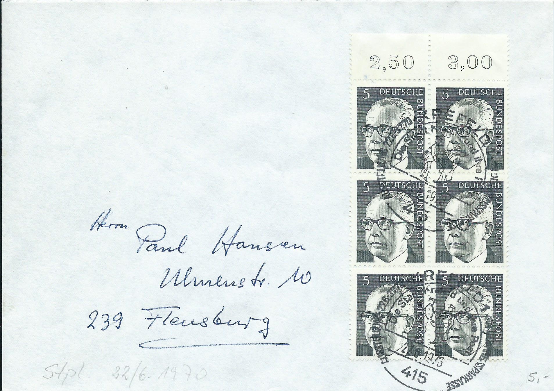 Beginnen möchte ich mit einer Mehrfachfrankatur 5 Pf auf einem Brief von Krefeld nach Flensburg. Es ist ein senkrechter 6-er-Block vom Oberrand für die Portostufe 30 Pf. Der Ortswerbestempel von Krefeld ist vom 22.6.70.
