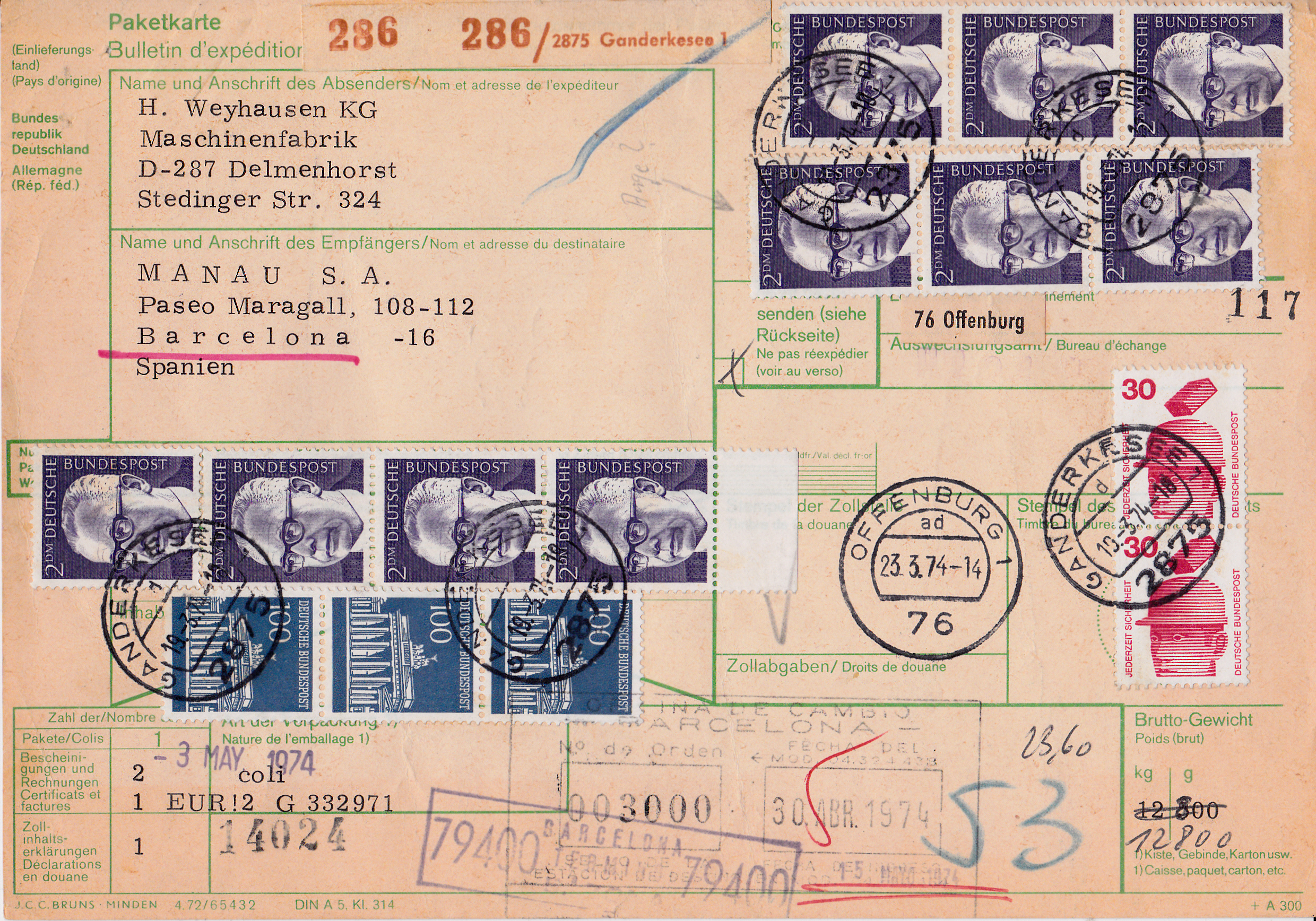 Auslandspaketkarte für ein Paket einer Firma aus Delmenhorst nach Barcelona. Das 12,800kg schwere Paket wurde am 19.3.1974 in Ganderkesee 1 aufgegeben. Die Portokosten in Höhe von 23,60DM wurden als Mischfrankatur mit zehn Marken zu je 2 DM Heinemann (MiNr 645), drei Marken zu 100 Pfennig Brandenburger Tor (MiNr 510) und zwei Marken zu 30 Pfennig Unfallverhütung (MiNr 698) auf der Paketkarte verklebt. Das Paket wurde am 23.3.1974 von Offenburg nach Spanien weitertransportiert. Am 30. April 1974 erreichte es Barcelona.