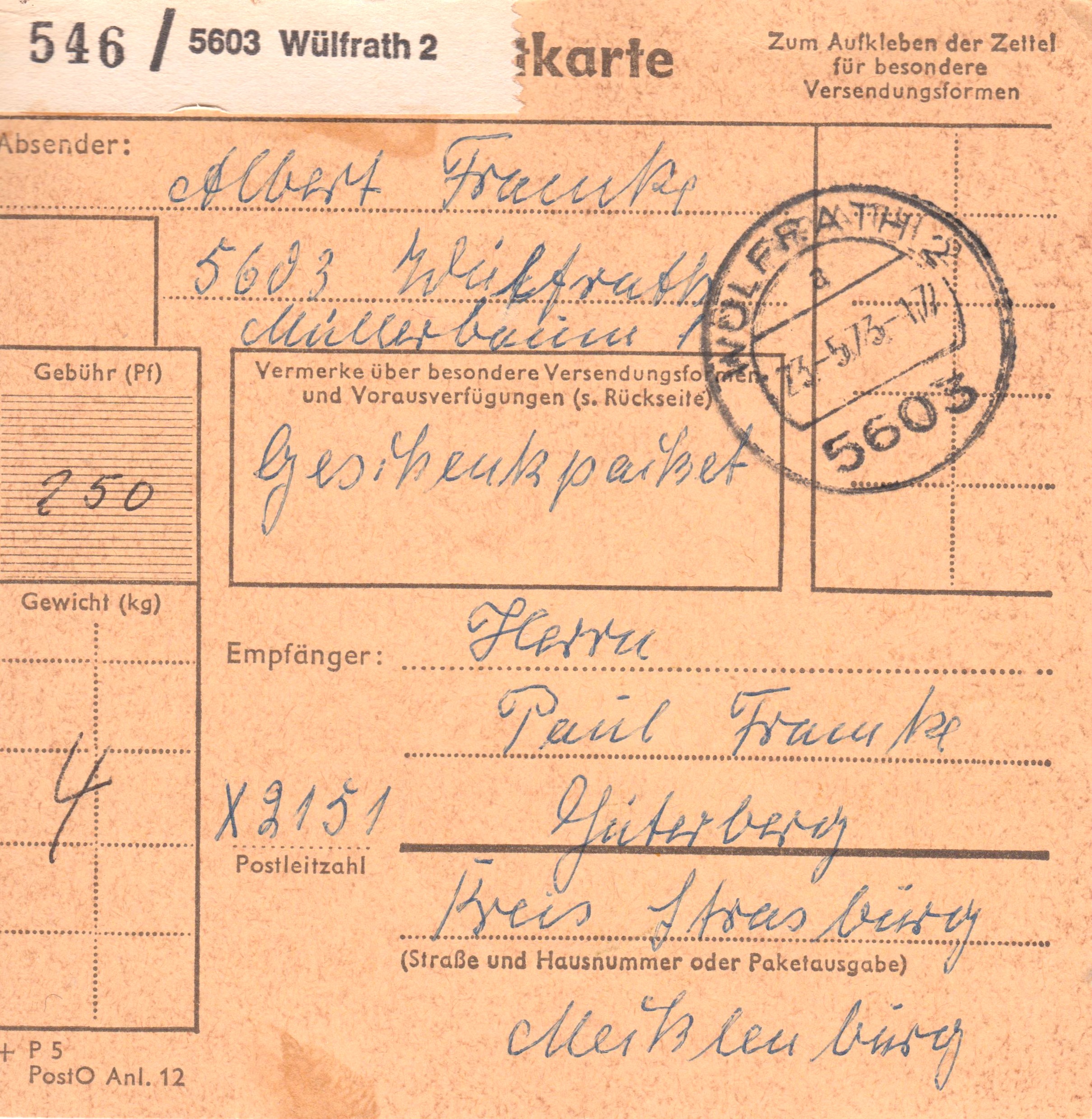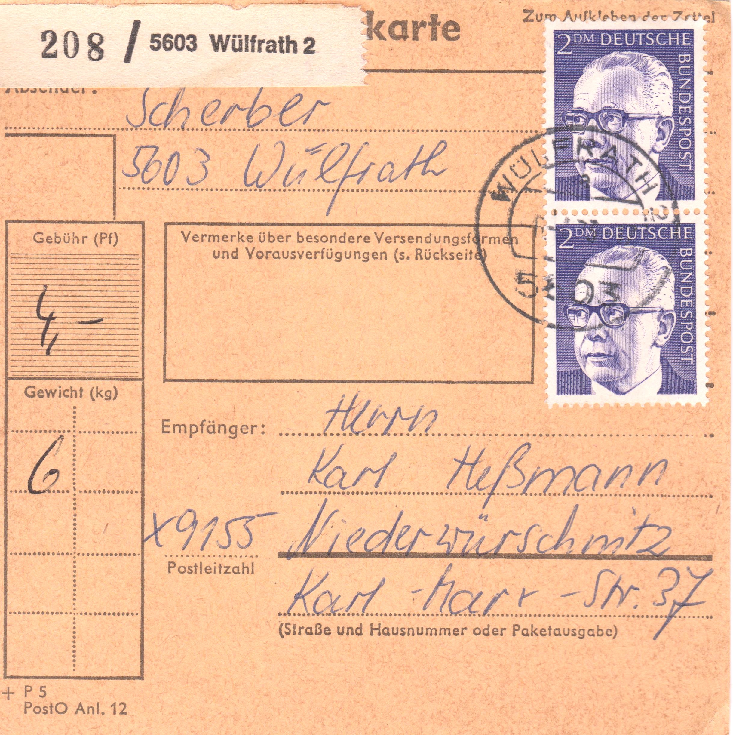 Paketkarte mit Mehrfachfrankatur 2 x 2 DM zur Abdeckung der Portostufe von 4 DM für ein Paket mit einem Gewicht von 6 kg in die DDR, aufgegeben in 5603 Wülfrath 2: