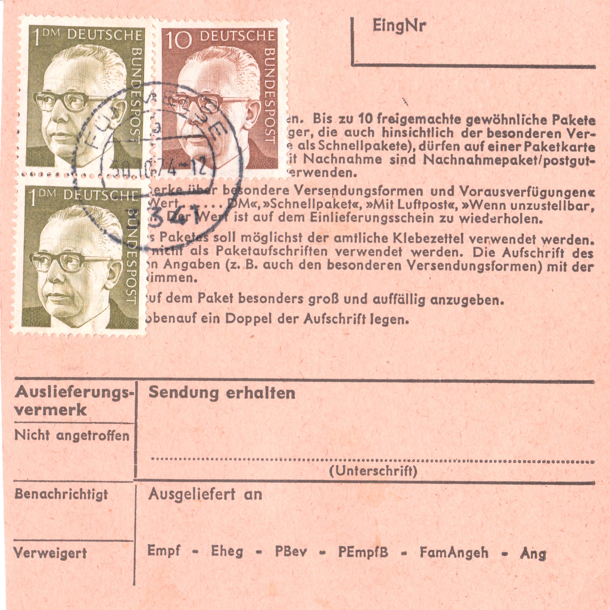 Paketkarte mit Mischfrankatur 2 x 150 Pf sowie 50 Pf zur Abdeckung der Portostufe von 3,50 DM für ein Paket mit einem Gewicht von 2 kg, aufgegeben in 2135 Hemsbünde: