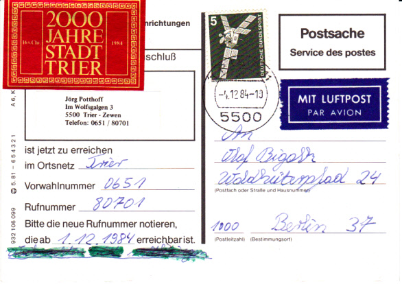 Eine Einzelfrankatur des Wertes zu 5 Pfennig war nur möglich bei portofreien Briefen bis 20 Gramm oder portofreien Postkarten, die innerhalb Deutschlands per Luftpost verschickt wurden. Portofrei waren z.B. Blindensendungen, Wahlbriefe oder Benachrichtigungen über Telefonanschlüsse. Hier zeige ich eine Postkarte mit Benachrichtigung über die Einrichtung einer Telefonverbindung von Trier nach Berlin. Die Karte hat einen Eindruck "Postsache Service des postes" und der Luftpostzuschlag wurde mit der Marke zu 5 Pfennig aus der Serie Industrie und Technik entrichtet (MiNr. 846).
