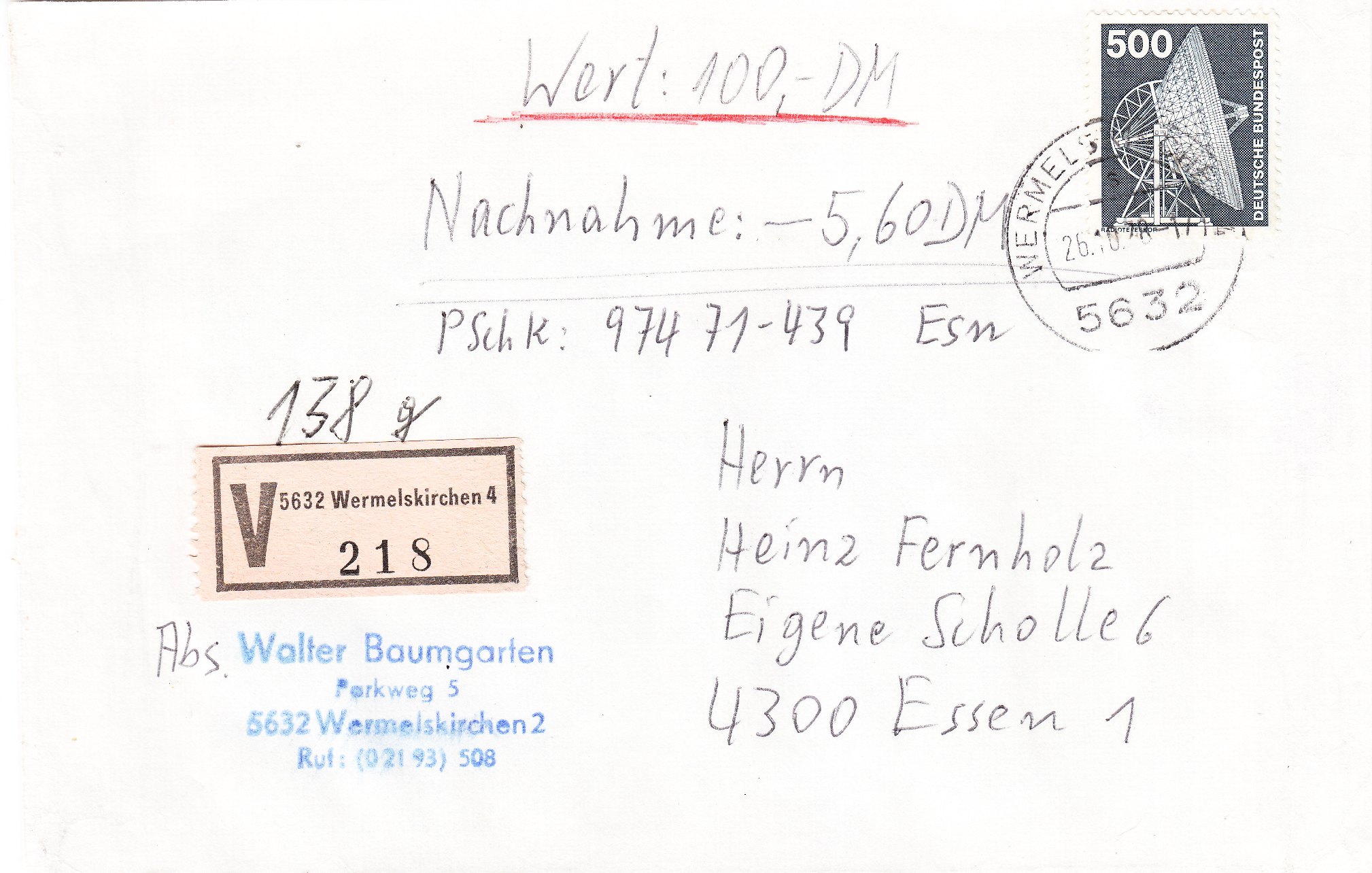 Fernbrief vom 26.10.1978 der Gewichtsstufe von 101 bis 250g, der in diesem Falle, wie bei Wertbriefen üblich, als tatsächlich "138 g" schwer dokumentiert wurde, Portostufe dafür 160 Pfennig, per Nachnahme, Porto 140 Pfennig, sowie als Wertbrief mit Wertangabe "100 DM", Porto 200 Pfennig = Porto 500 Pfennig.
