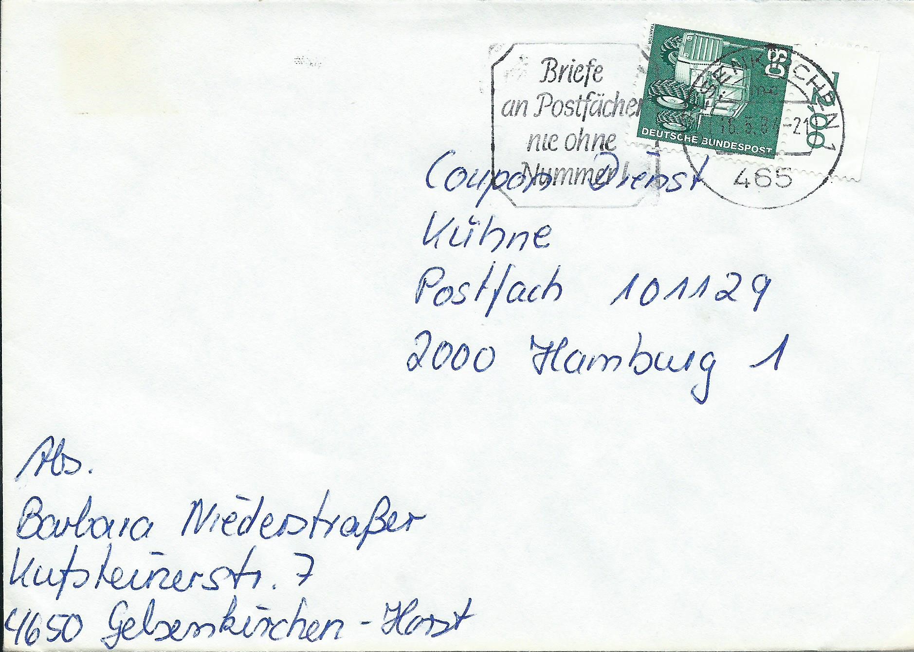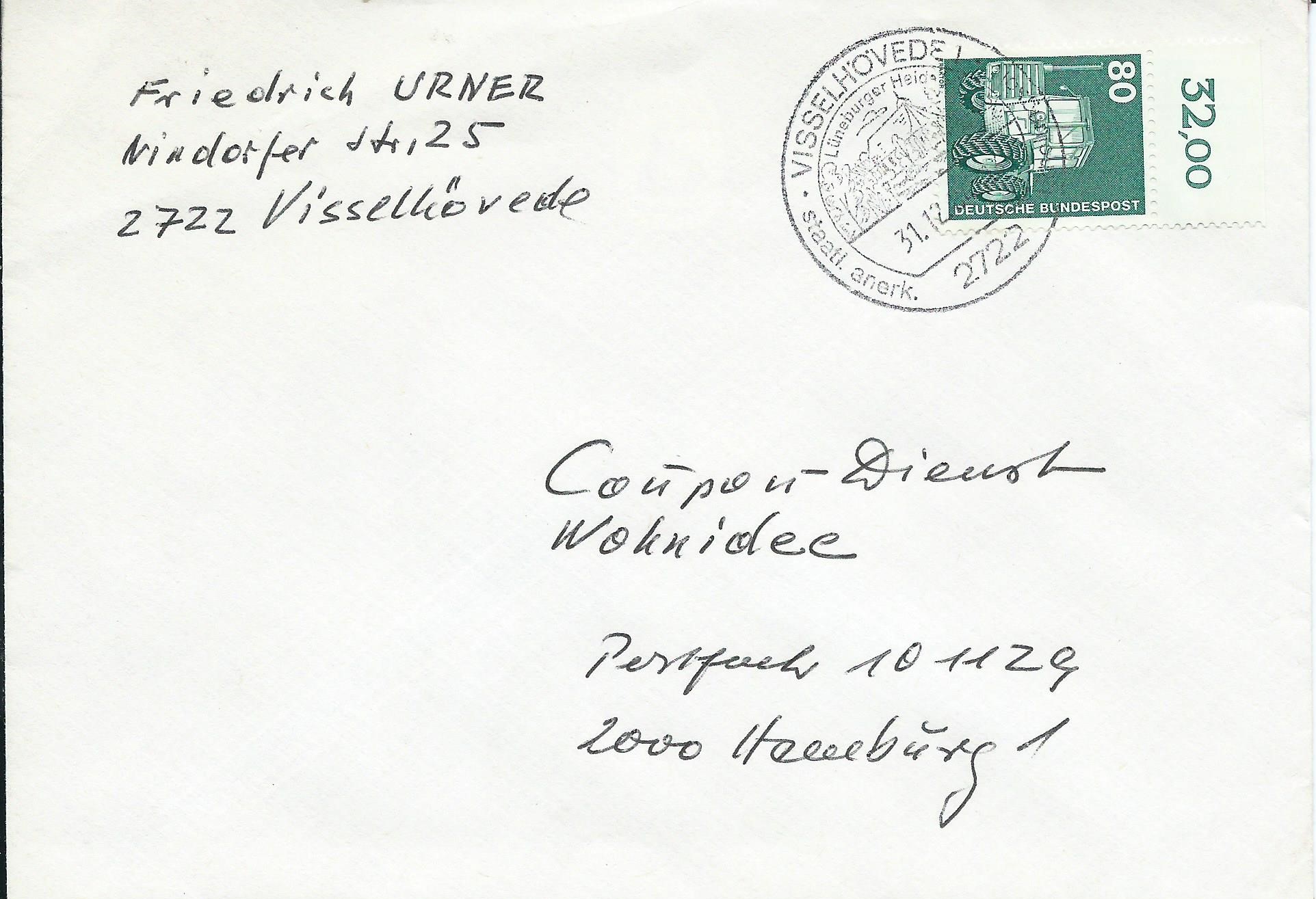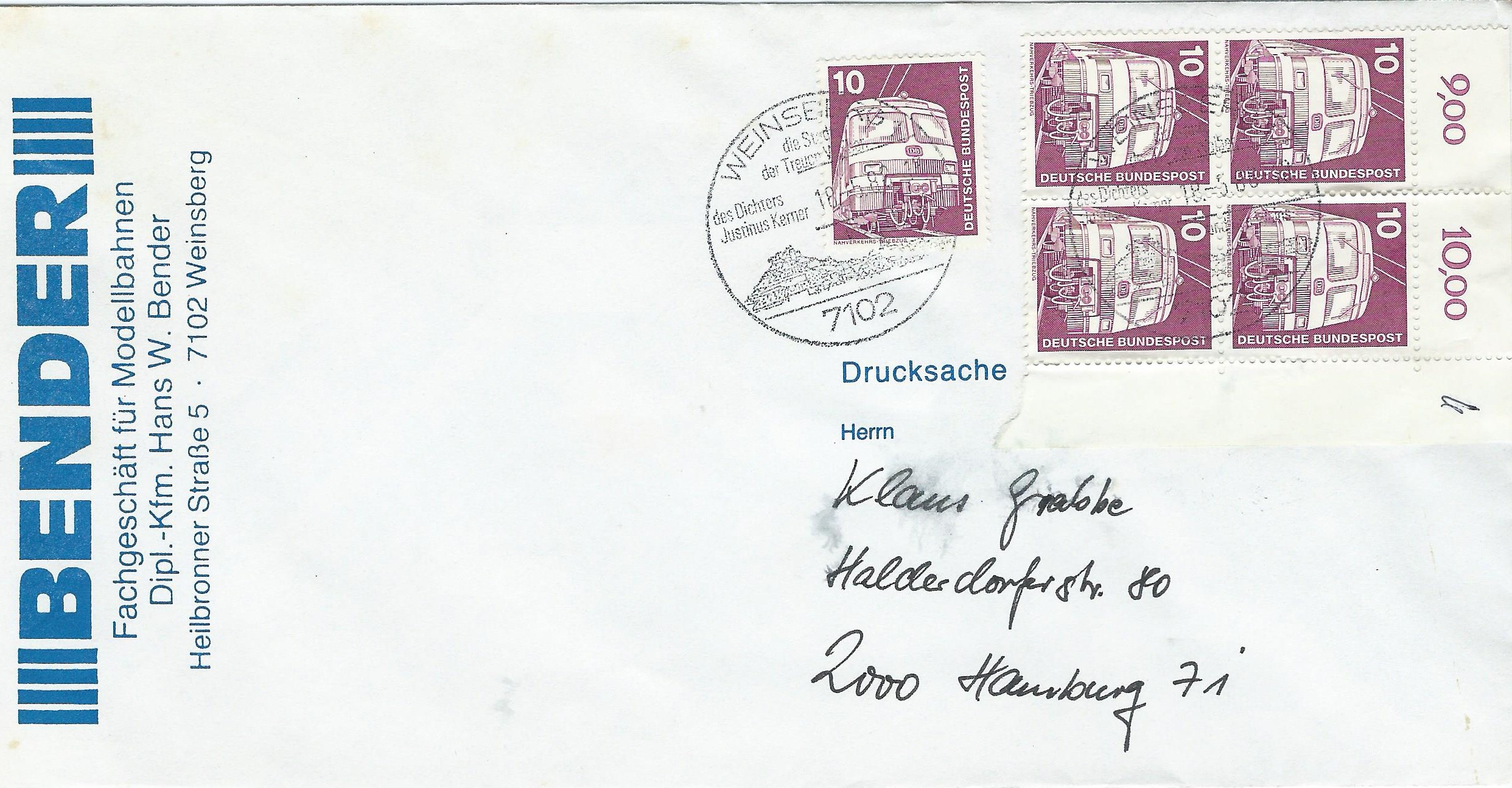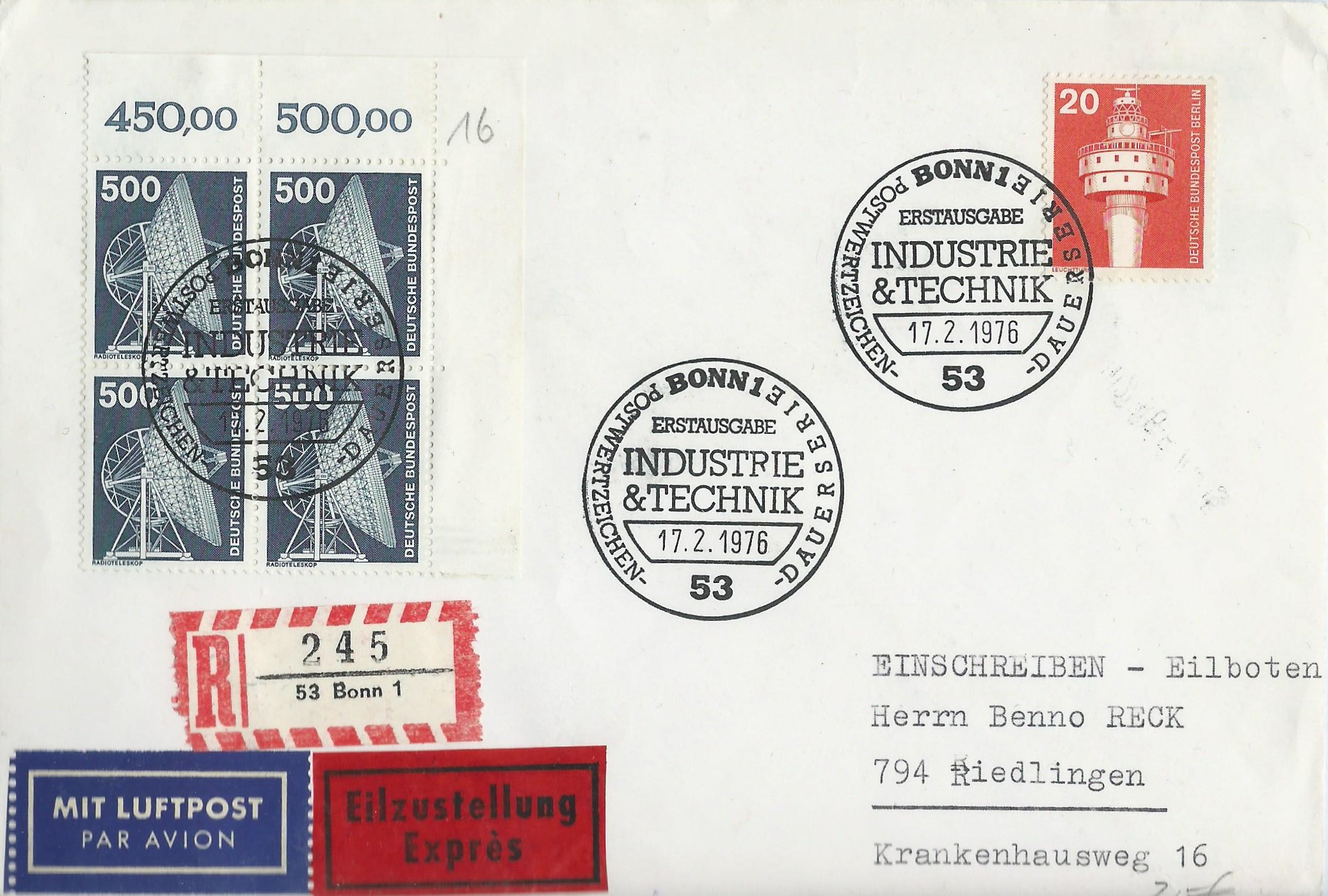 Abschließend für heute ein hoffnungslos überfrankierter Brief mit einem 4-er-Block zu 500 Pf aus der rechten oberen Bogenecke nebst einer Berlin-20-Pf-Marke. Befördert wurde er als Einschreiben, Luftpost- und Eilbrief. Gestempelt wurde mit dem Ersttagssonderstempel Bonn am 17.2.76. Aber wo der Absender da eine Portostufe von 20,20 DM her hat, bleibt wohl sein Geheimnis. Egal, bei mir bekommt der Beleg eine neue Heimat, ich sehe mit der virtuellen Schere nur den schönen 4-er-Block aus der Bogenecke und somit ist der Platz im Album sicher.