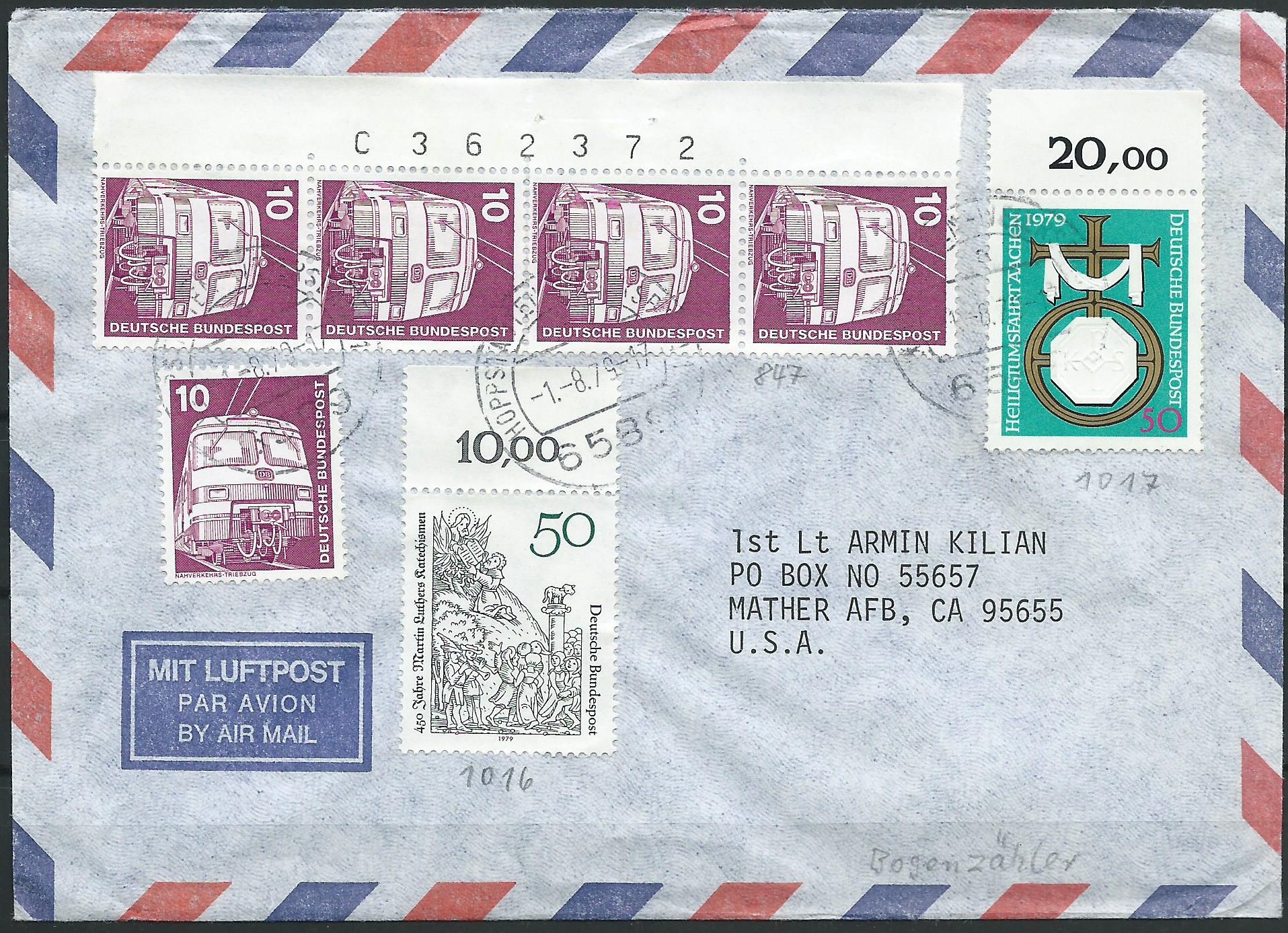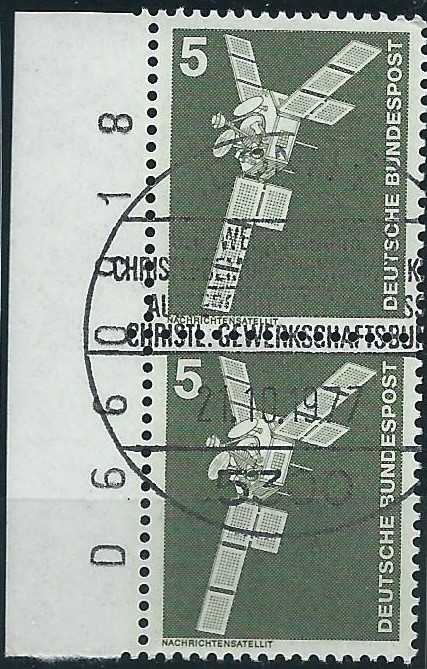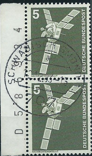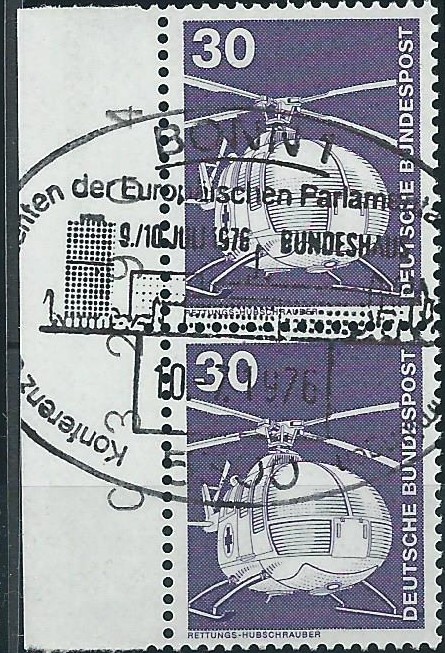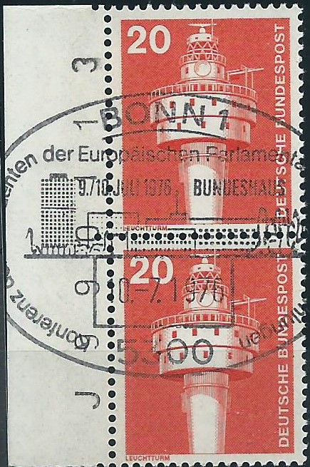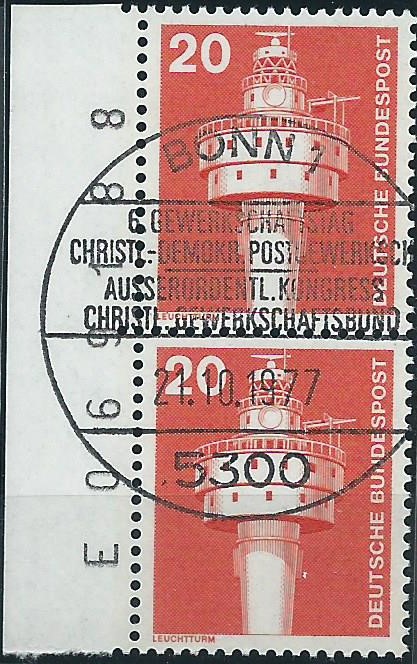 Den Anfang macht der Wert zu 5 Pf im senkrechten Paar vom linken Bogenrand und 6-stelligem Bogenzähler mit vorangestelltem Buchstaben D. Gestempelt wurde mit einem Sonderstempel Bonn am 20.10.77.