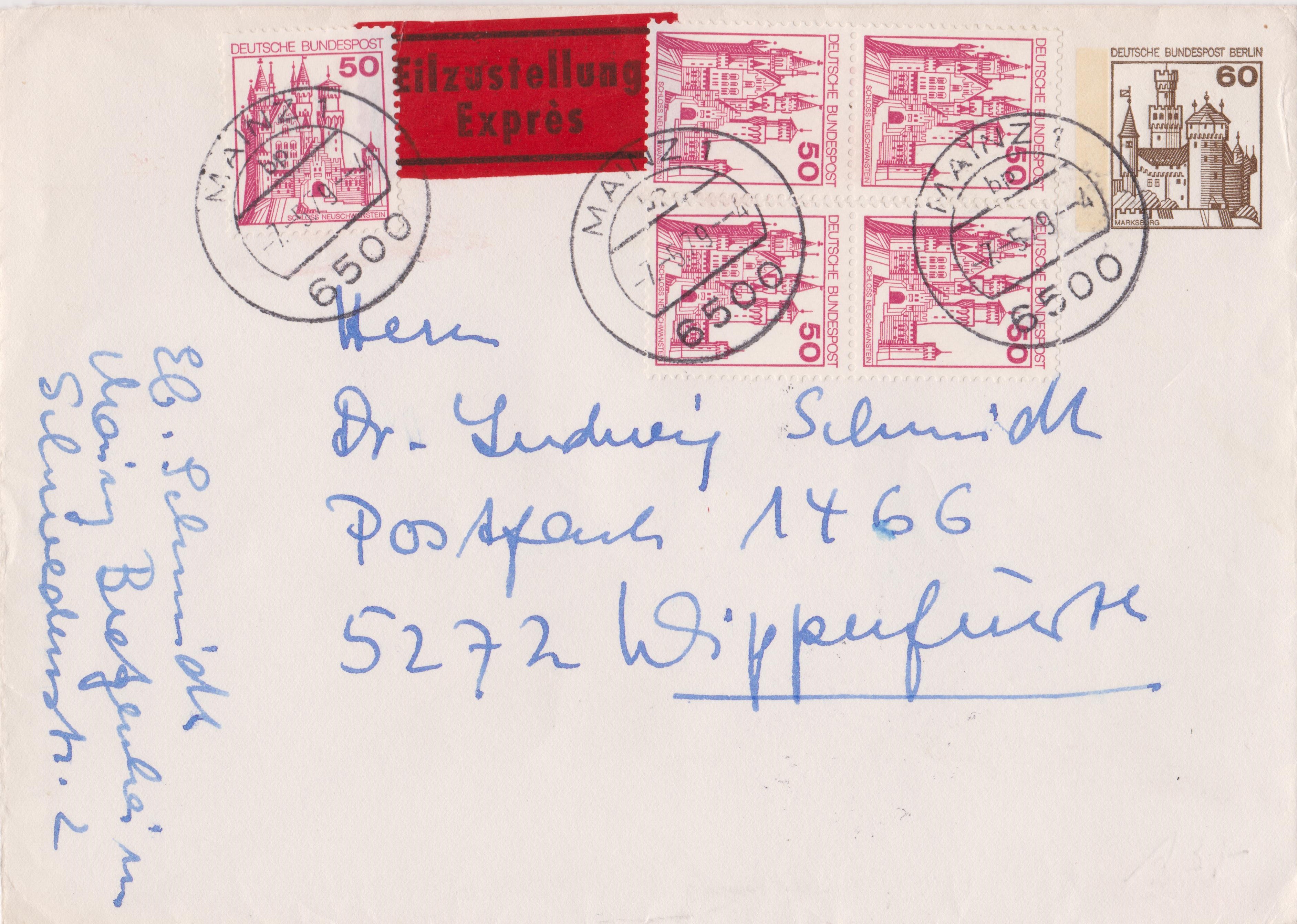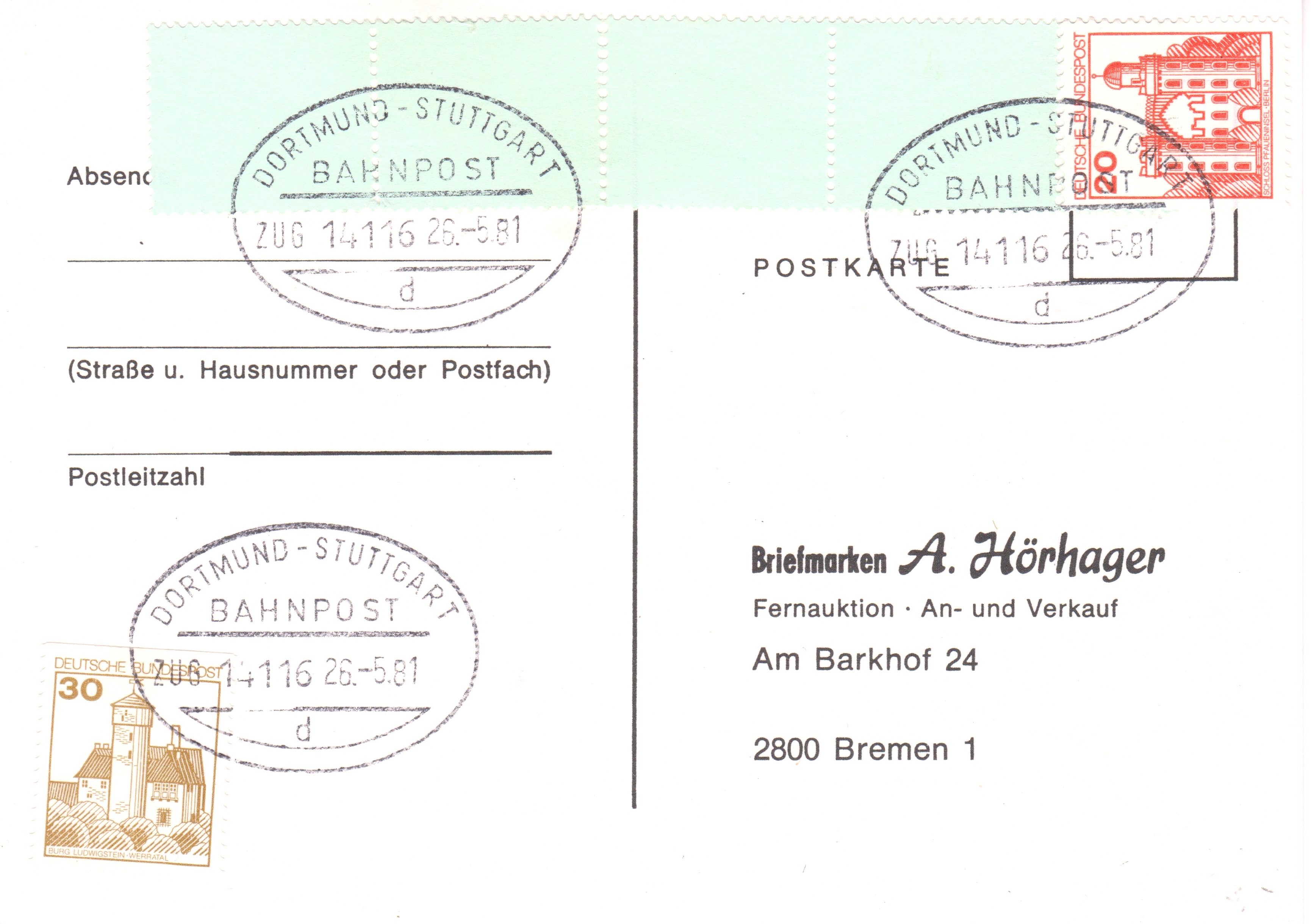 aus der Serie Burgen und Schlösser kommt hier ein Beleg mit 3 Rollenenden. Das ist natürlich absolute Spielerei eines Sammlers, aber trotzdem schön anzuschauen. Wir haben da je ein Rollenende 5 + 4 zu 60 Pf der alten (braunen) und neuen (roten) Ausgabe sowie ein Rollenende 2 + 4 zu 40 Pf der 2. Ausgabe. Gestempelt wurde der Beleg, der als Einschreiben per Eilboten lief, am 26.5.84 mit einem Sonderstempel von der Briefmarkenmesse Essen.