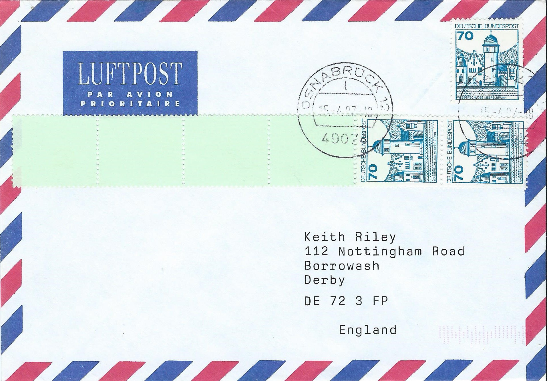 Ein Luftpostbrief mit einem Rollenende 2 + 4 nebst einer Einzelmarke zu 70 Pf, gestempelt in Osnabrück am 15.4.97: