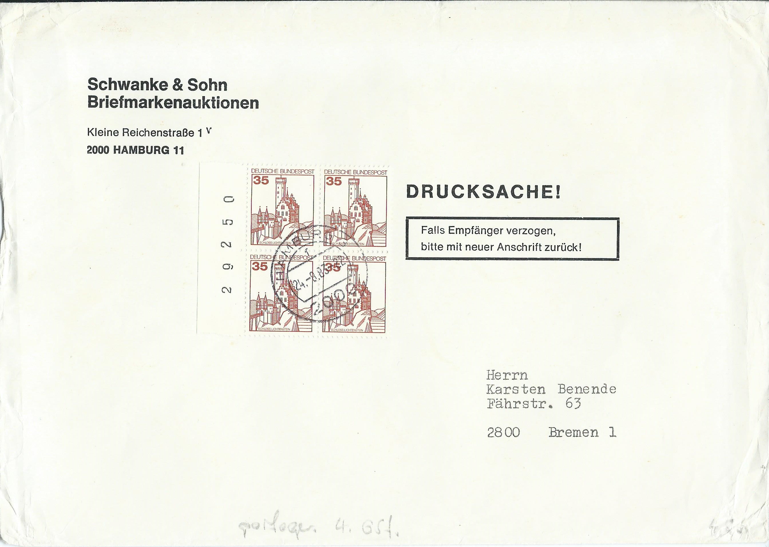 Eine Drucksache, frankiert mit einem 4-er-Block der 35 Pf –Marke Schloss Lichtenstein vom linken Bogenrand. Auf diesem Bogenrand sehen wir noch die aufgedruckte Bogenzählnummer. Das Ganze wurde als Drucksache verschickt, gestempelt in Hamburg am 24.8.83. An den Absender habe ich nur gute Erinnerungen, es hat immer grosse Freude bereitet, dort zu besichtigen und den Auktionen beizuwohnen. Schade, dass es das Haus in der Form nicht mehr gibt, nachdem Herr Schwanke in den Ruhestand getreten ist. Was aber nicht heissen soll, dass sich eine Reise nach Hamburg zu seinem Nachfolger nicht mehr lohnt, auch dort sind immer gute Sachen zu finden.