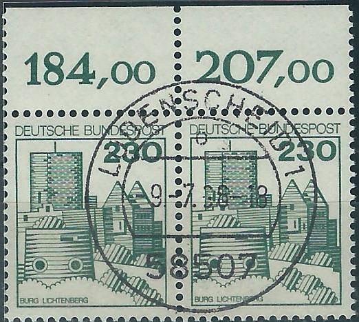 ein waagerechtes Paar der Burgen und Schlösser 230 Pf-Ausgabe mit Oberrand und Reihenwertzähler 184,00 bzw. 207,00. Gestempelt wurde es am 9.7.98 in Lüdenscheid 1: