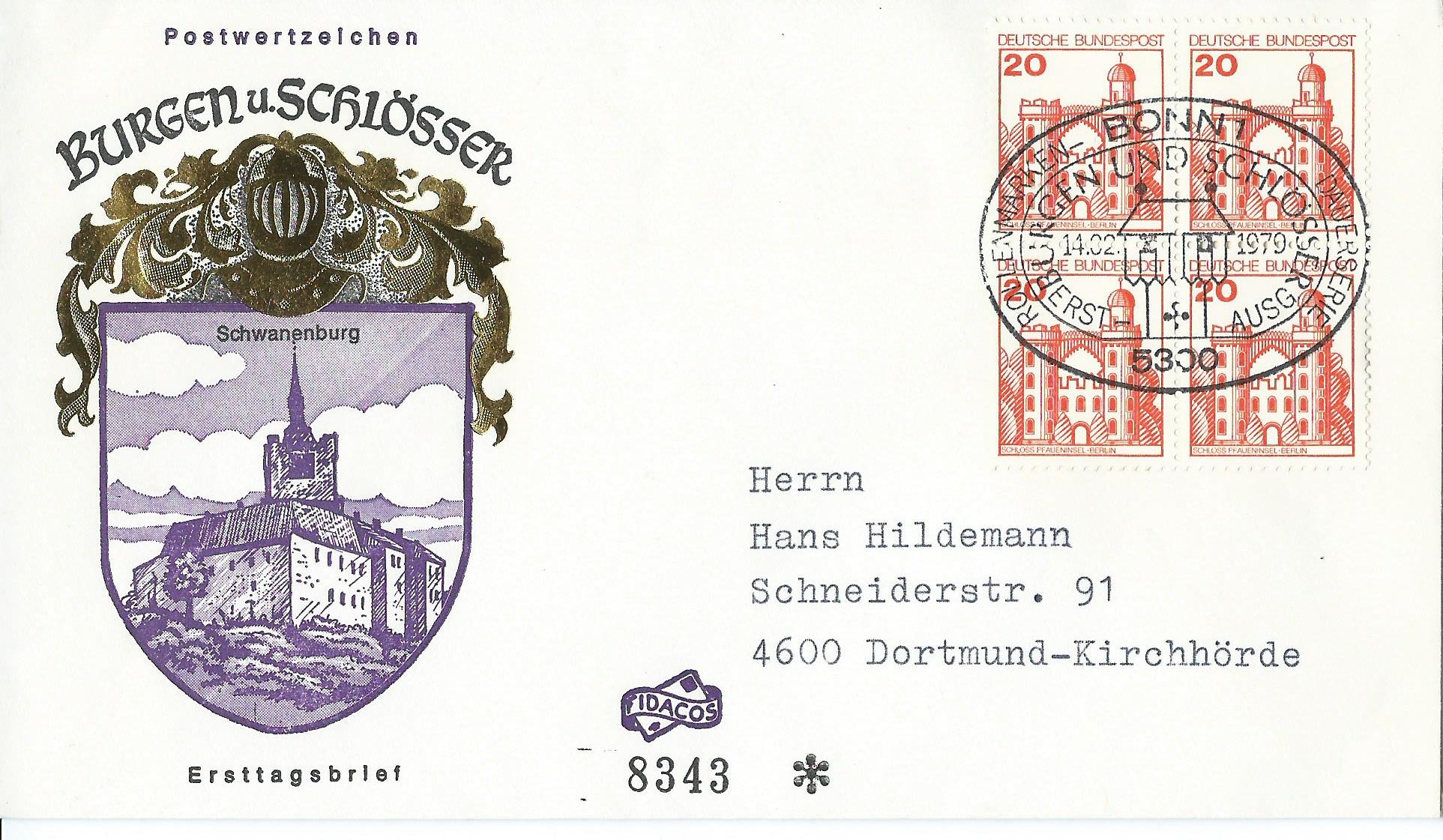 Den Anfang macht der Wert zu 20 Pf als 4-er-Block auf einem Ersttagsbrief. Gestempelt wurde mit dem Ersttagssonderstempel Bonn vom 14.2.1979.