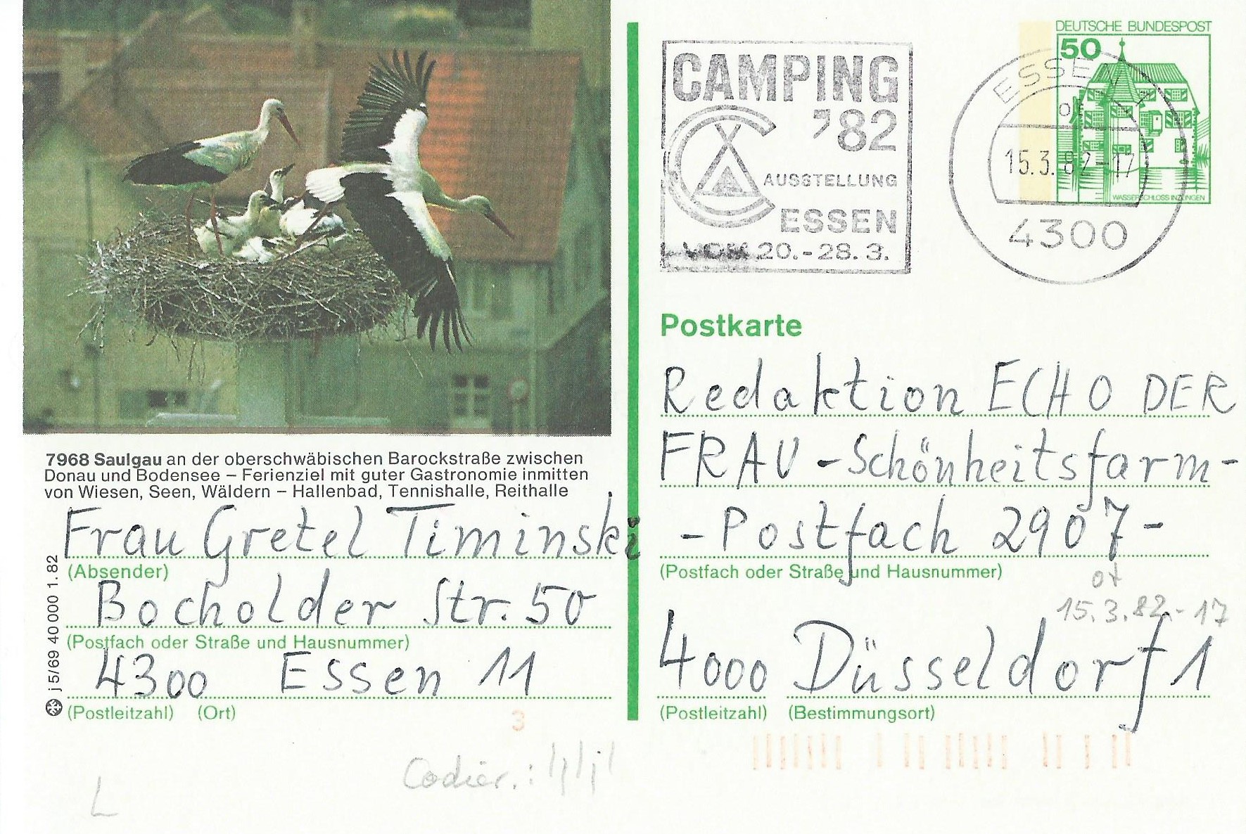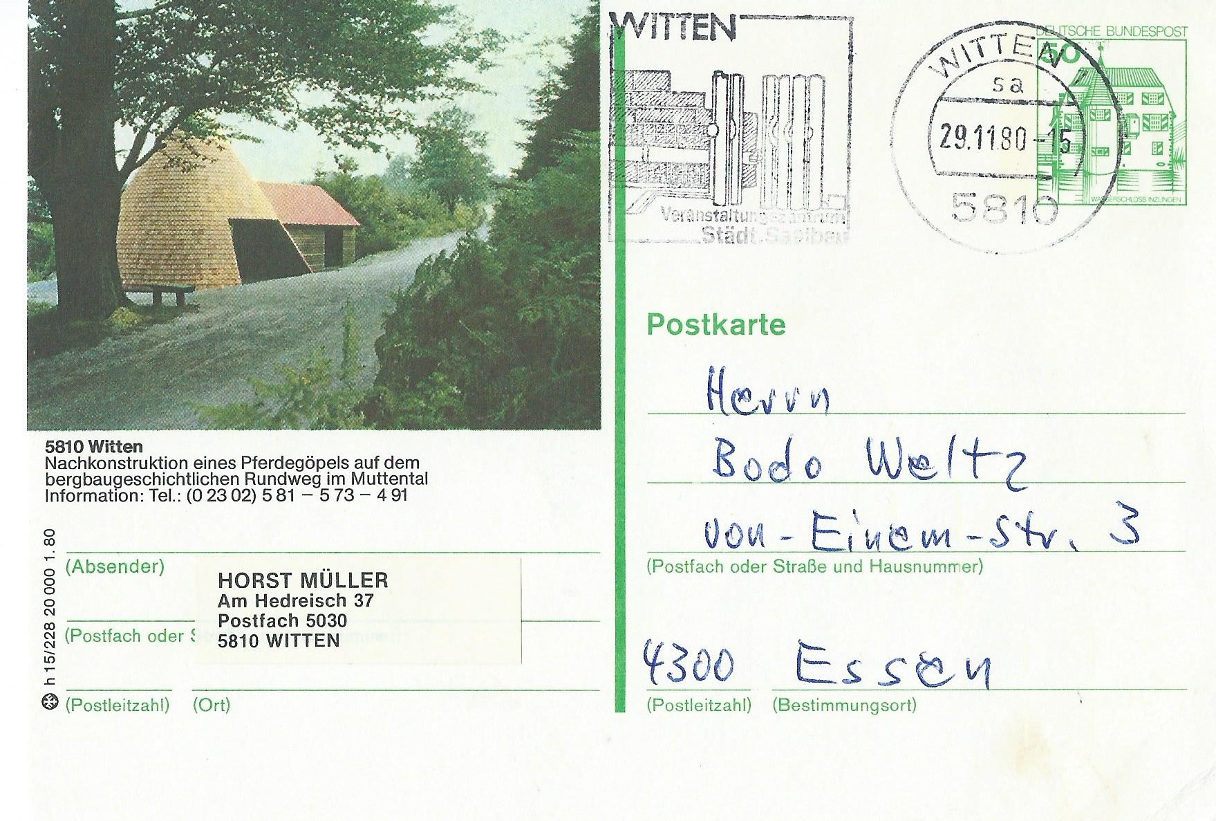 Den Anfang machen einige Postkarten aus dem Jahre 1984, welches an dem Druckvermerk links neben dem Bild zu erkennen ist. Hier nun eine Postkarte mit einer Ansicht von Bocholt, gestempelt wurde die Postkarte am 8.4.84 in Essen.