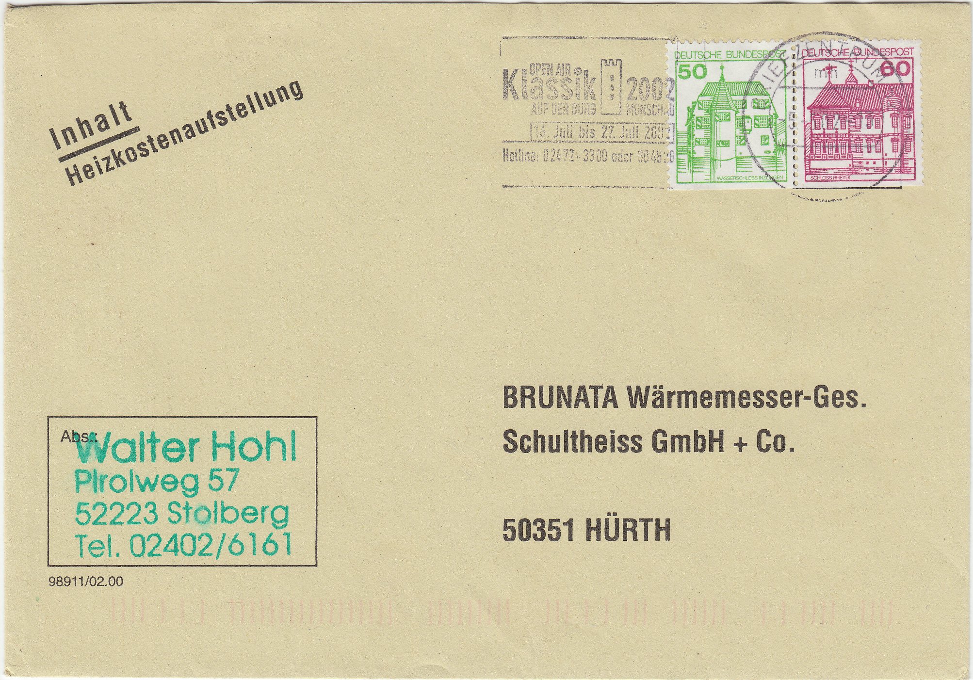 Zusammendruck W 74, MiNr. 1038 D I u/1028 D I, unten geschnitten aus dem Heftchenblatt 28 aus Markenheftchen 23 stammend, am 05.05.2002 portorichtig auf Standardbrief (110 Pf):